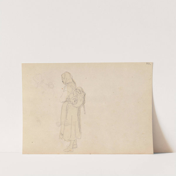 This is a delicately drawn pencil sketch titled "Kvinne med barn på ryggen" (Woman with Child on Back), created by the artist Adolph Tidemand. The artwork features a serene and compassionate figure of a woman, seen in profile from the...