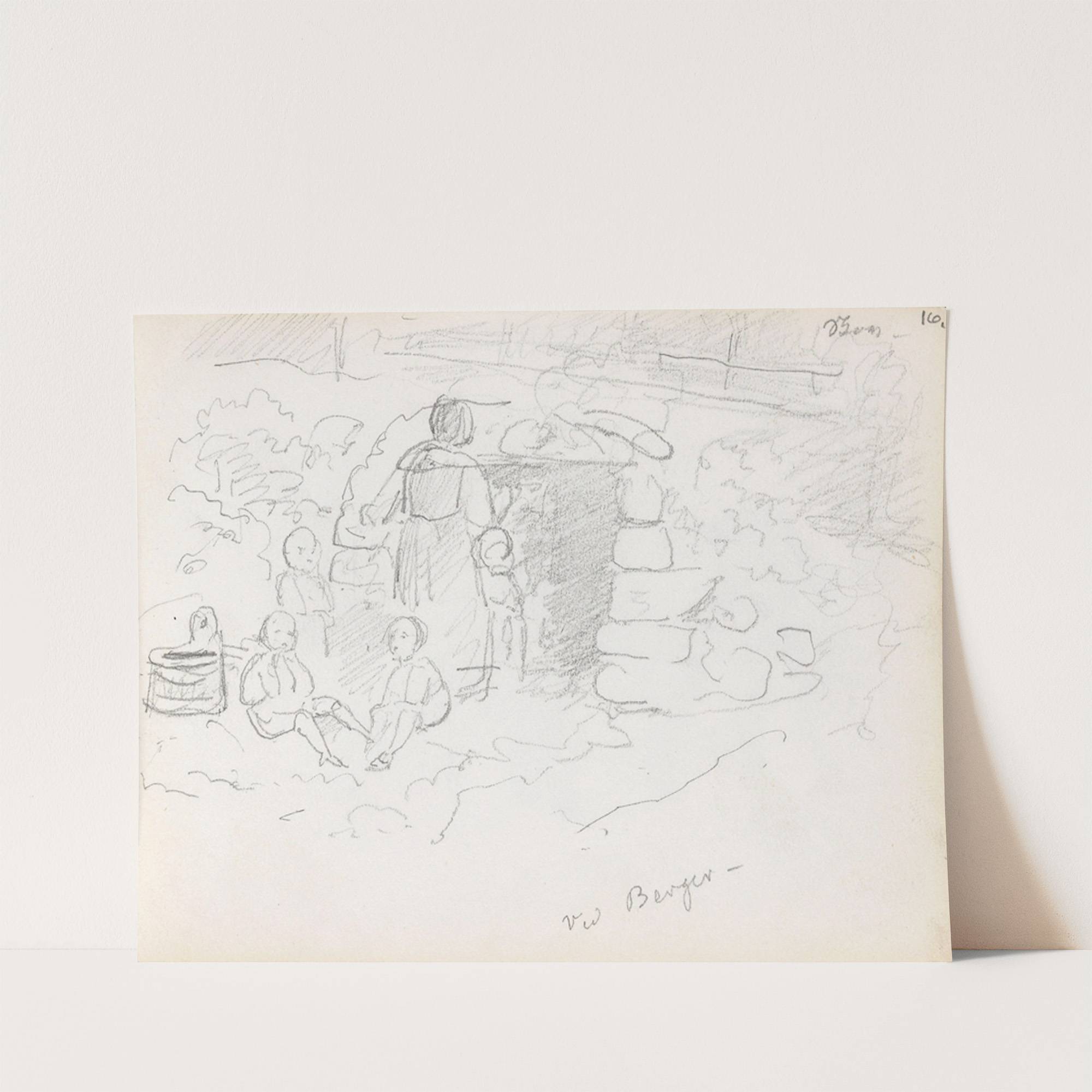 This is a delicate pencil sketch of "Kvinne og barn udenfor tunnel" by Adolph Tidemand, created in 1872. The artwork features an outdoor scene with minimalistic yet expressive line work. At the center, there's a woman standing and holding onto...