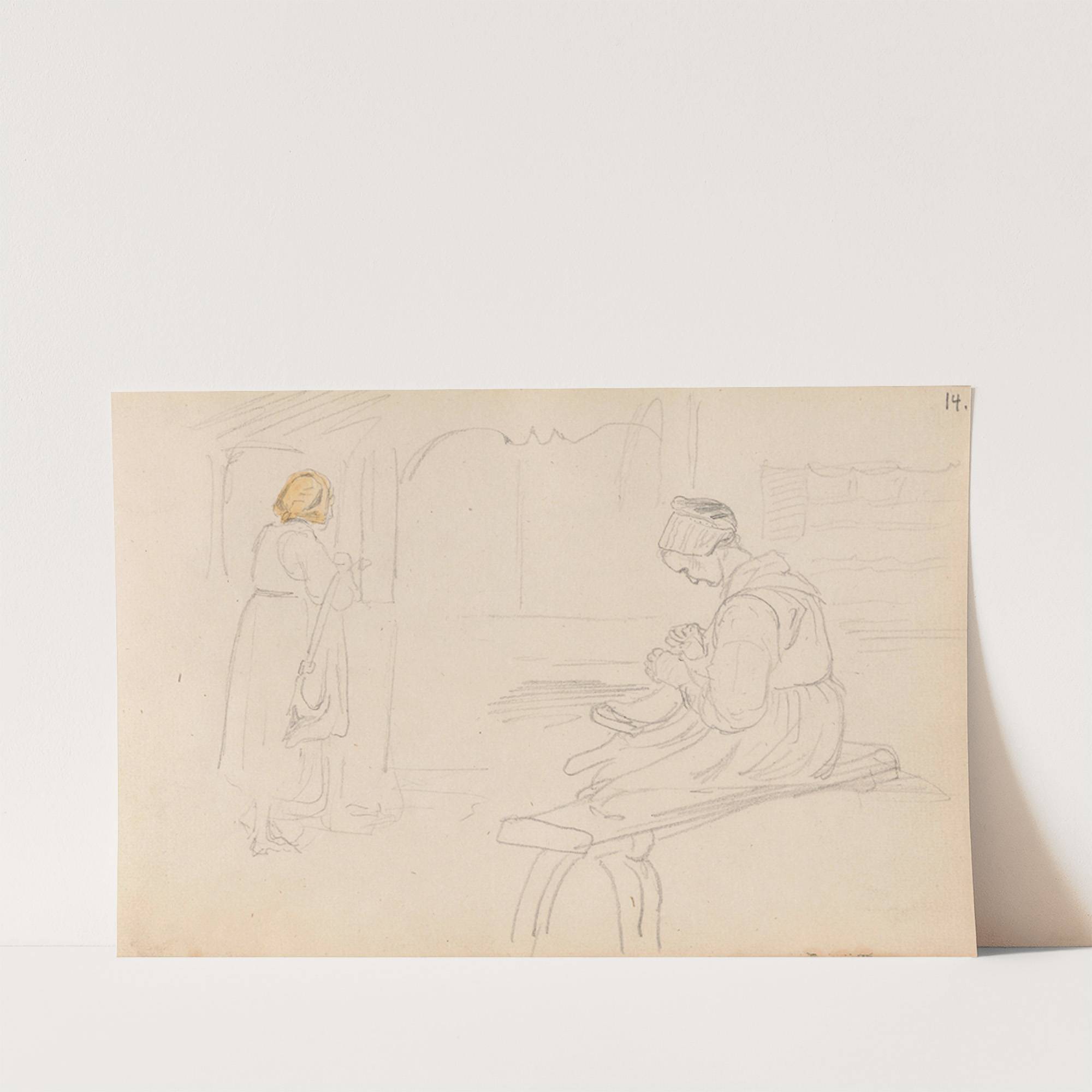 Kvinnefigur ved bygning; kvinne med håndarbeid (1852)