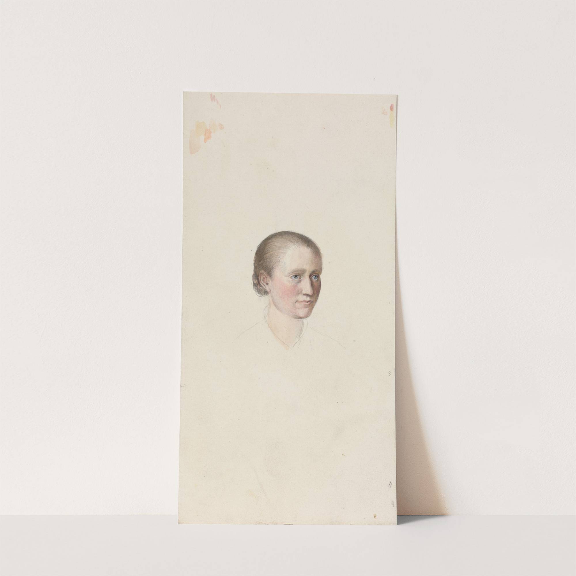 This art print features "Kvinnehode" (Woman's Head) by the renowned artist Adolph Tidemand. The composition is strikingly minimalist, with a white background that highlights the central subject: a woman's head and upper shoulders. The figure is rendered in soft, natural...