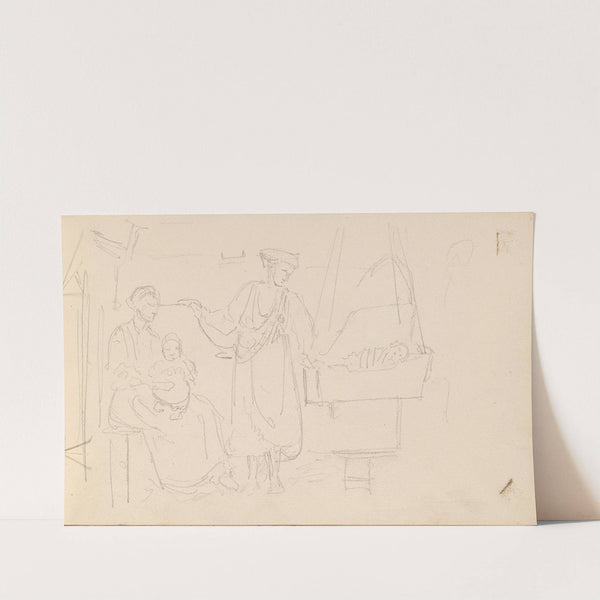 This art print features a minimalist line drawing of "Kvinner og barn i interiør" by Adolph Tidemand, created in the style of late 19th-century Nordic realism. The illustration depicts two figures within an indoor setting: on the left, a seated...
