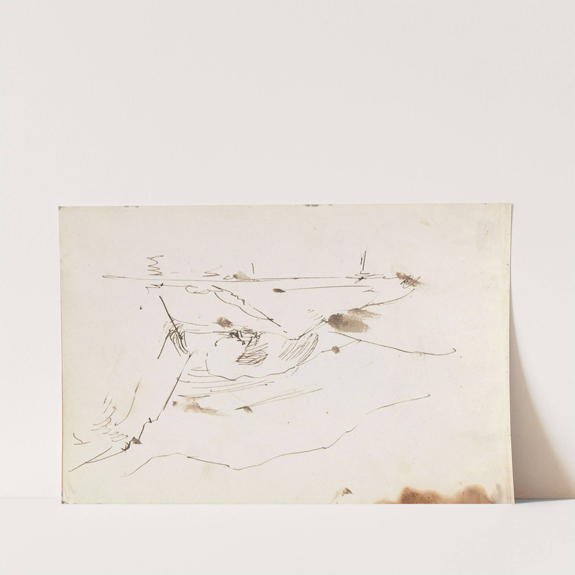 This art print features "Landskapsriss" by Adolph Tidemand, a masterful example of minimalist line drawing with subtle yet expressive touches. The composition is characterized by delicate, fluid black lines that meander across a crisp white background, creating an impressionistic landscape....