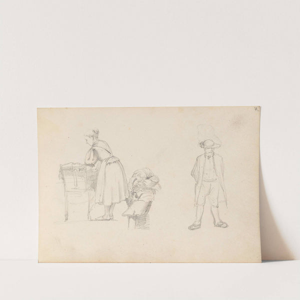 This art print features a delicate pencil sketch of three figures in early 19th-century attire, created by artist Adolph Tidemand. The drawing showcases a minimalist yet evocative style with soft, monochromatic lines. On the left, a standing figure is seen...