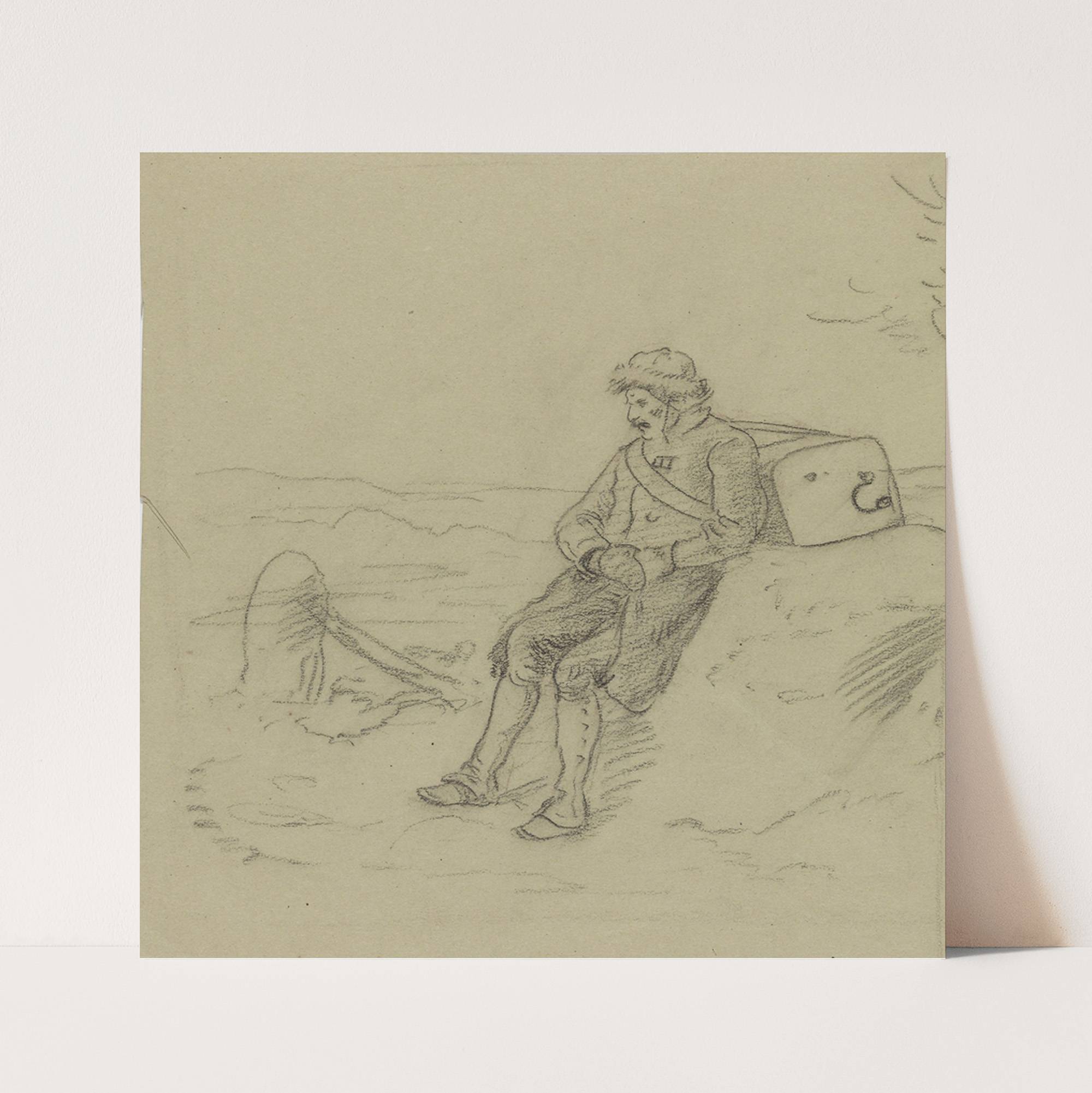 This monochromatic pencil drawing captures a poignant scene of contemplation in nature. The subject is a young man with slightly tousled hair, seated on a rustic rock that leans against a larger, block-like structure adorned with a simple crescent moon...
