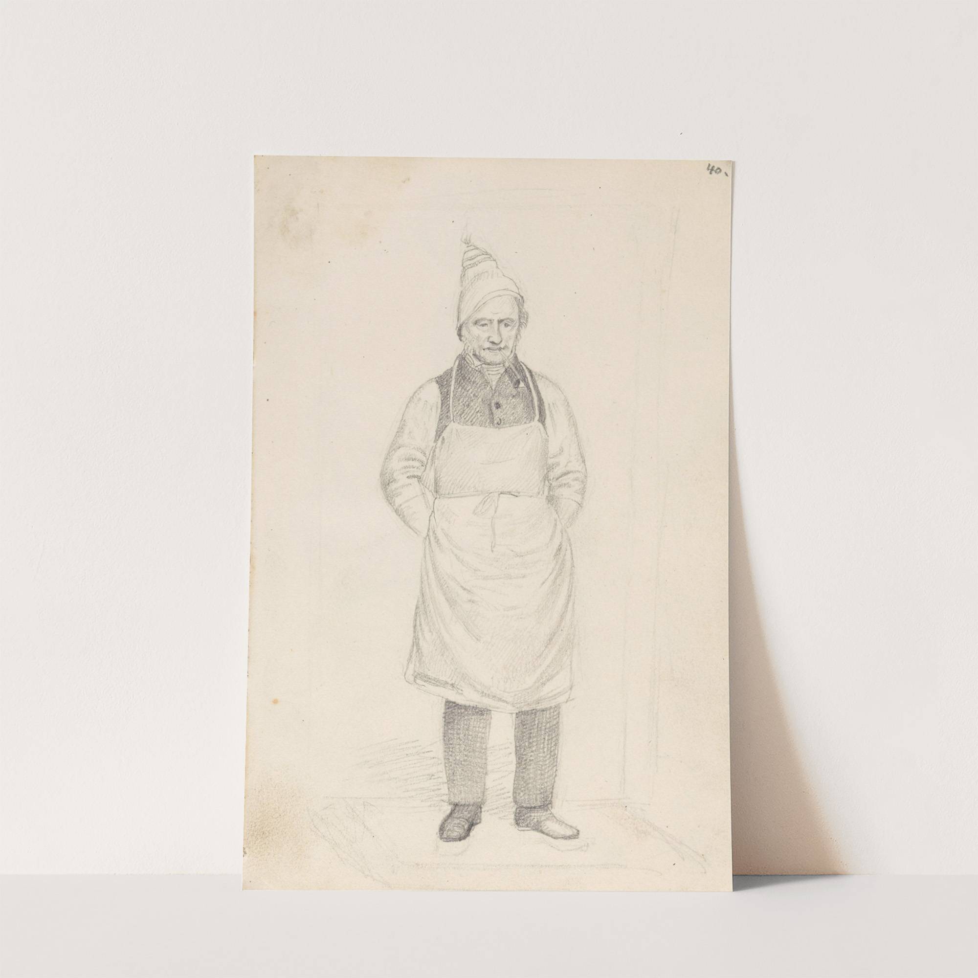 This is a monochrome pencil drawing of "Mann med forkle" by Adolph Tidemand, showcasing a traditional-style portrait with meticulous attention to detail. The subject is an older man standing in a relaxed pose, wearing a white chef's hat and a...