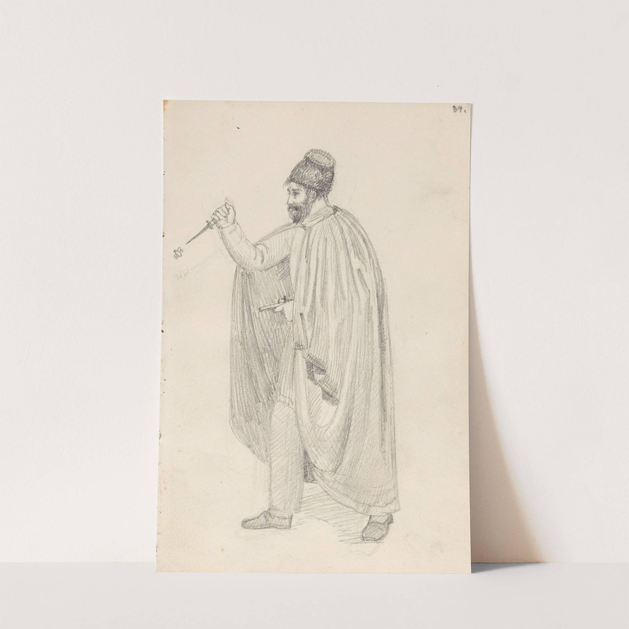 This monochromatic drawing features "Mann som jager en flue med kniv" (Man Hunting a Fly with a Knife), created by Adolph Tidemand in 1835. The artwork showcases a man in mid-action, delicately holding a fly between his thumb and forefinger...