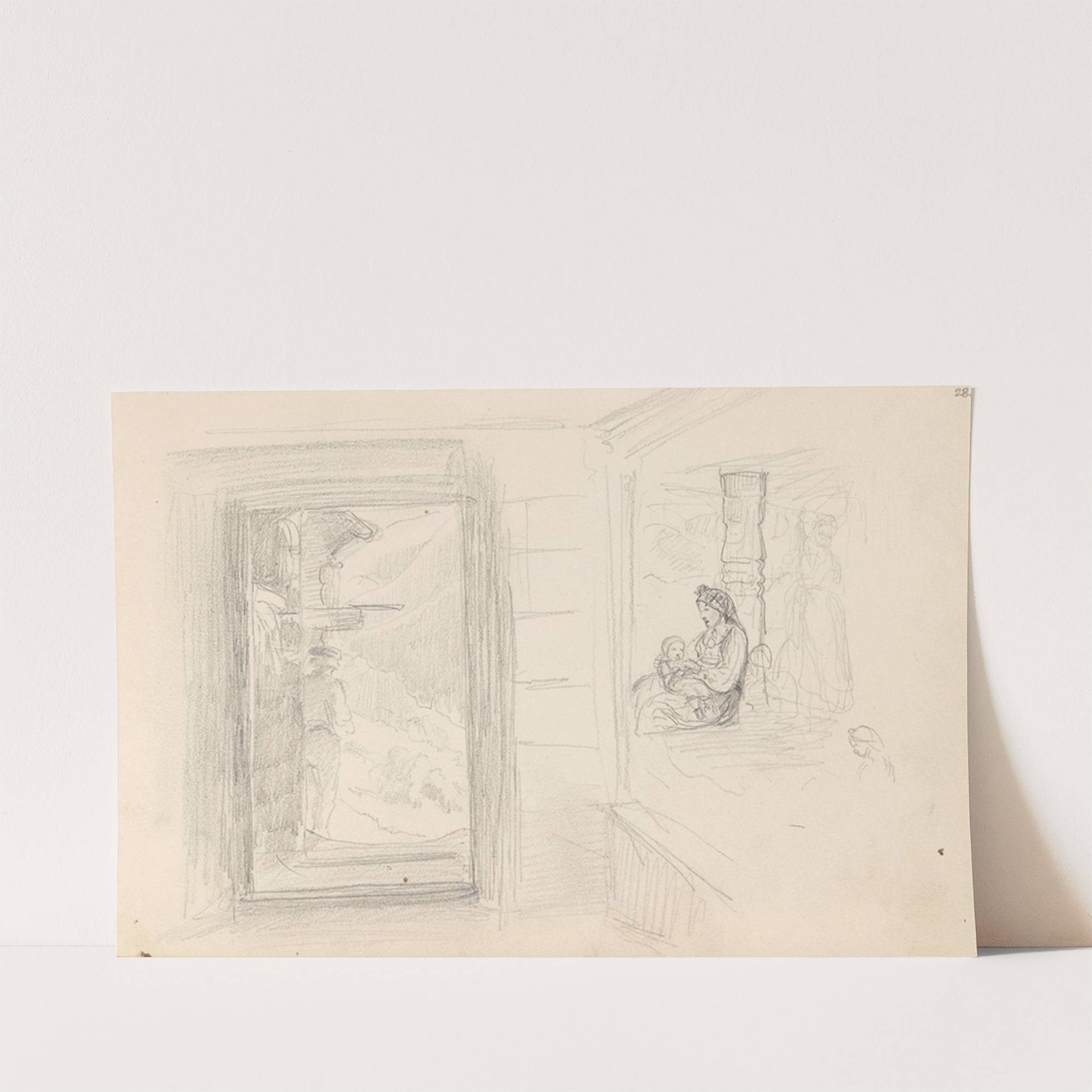 This monochromatic sketch captures the essence of Adolph Tidemand's "Mannsfigur i døråpning; kvinne med barn" from 1857. The artwork, rendered in delicate pencil strokes, depicts a domestic interior scene with gentle realism and subtle shading. On the left side of...