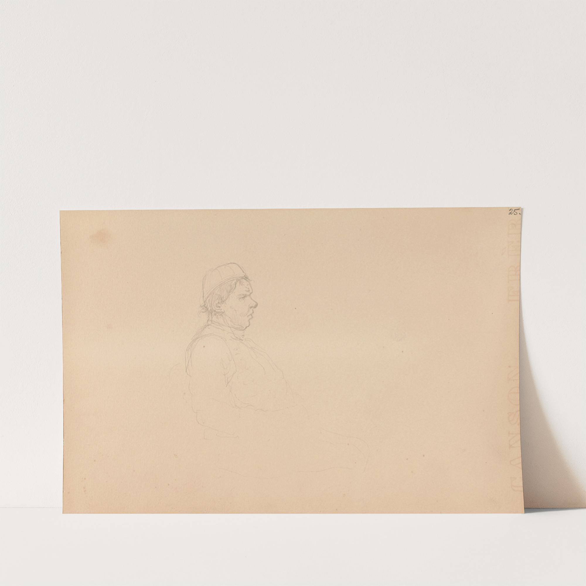 This minimalist line drawing features "Mannsfigur i profil" by Adolph Tidemand. Rendered in delicate, monochromatic pencil lines, the artwork showcases a side profile of a man with short, slightly tousled hair. The figure is lightly sketched, emphasizing simplicity and subtle...