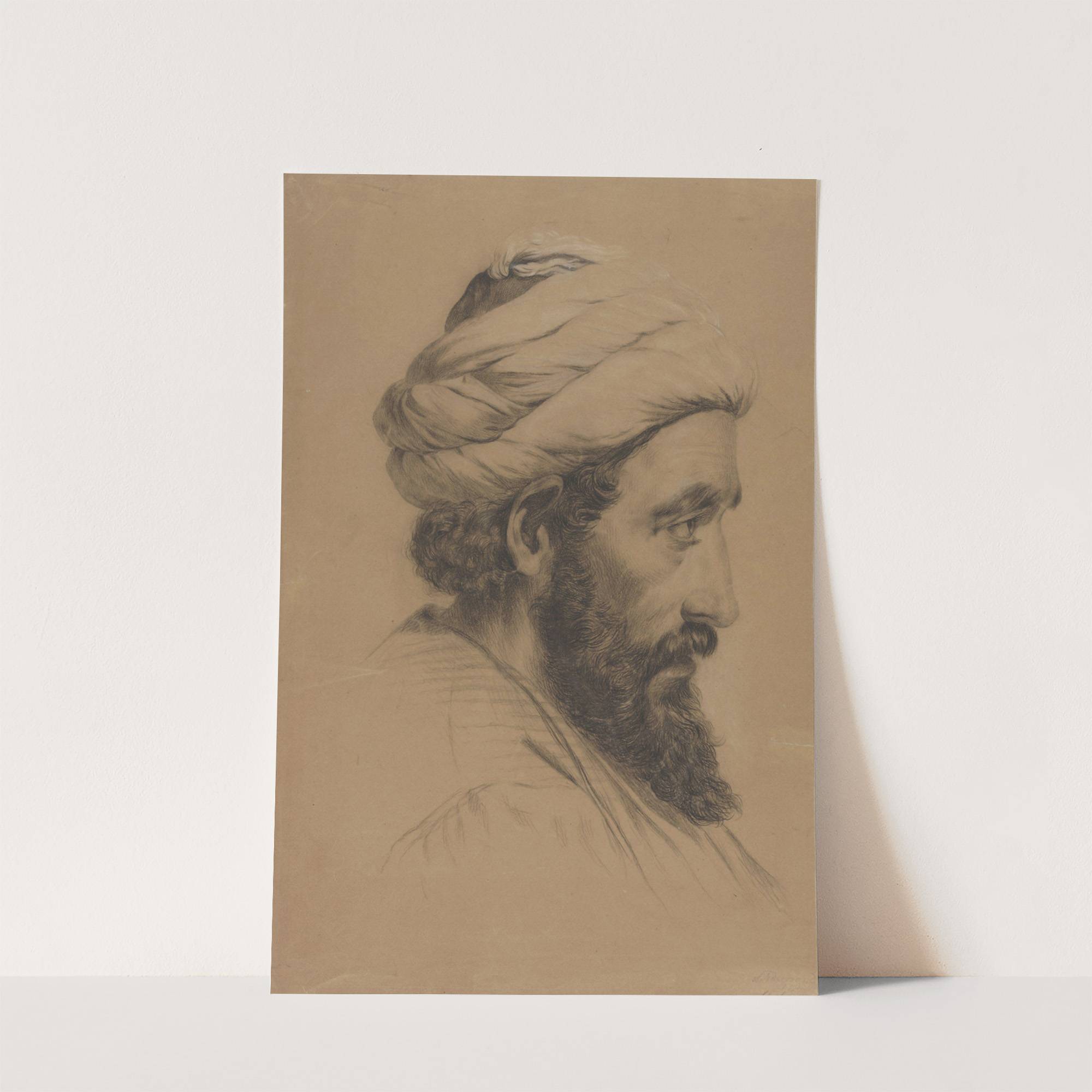 This striking portrait depicts a bearded man in profile view, expertly rendered by the artist Adolph Tidemand. The monochromatic pencil drawing showcases fine detailing and texture, particularly in the man's facial hair and intricately wrapped turban. The turban is delicately...