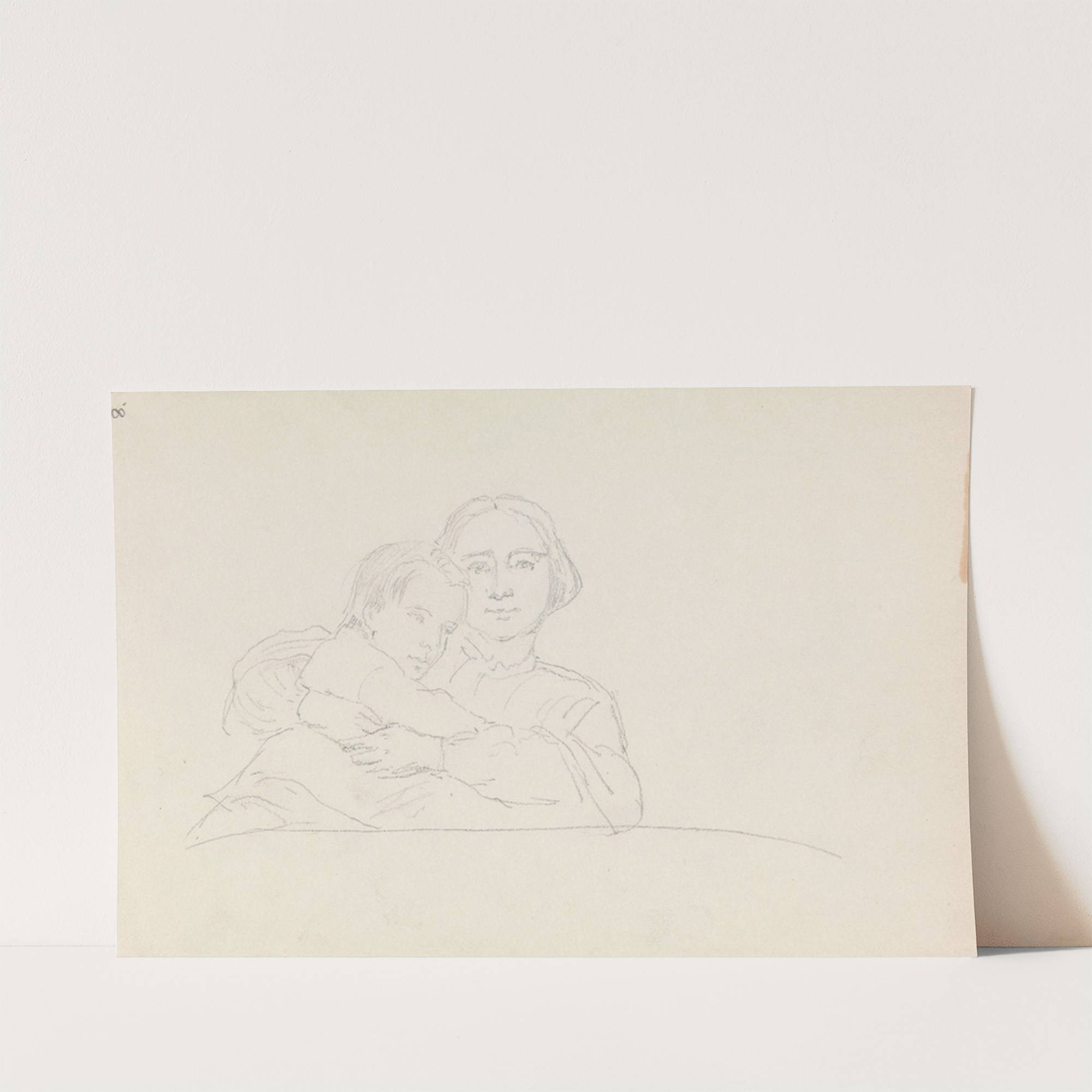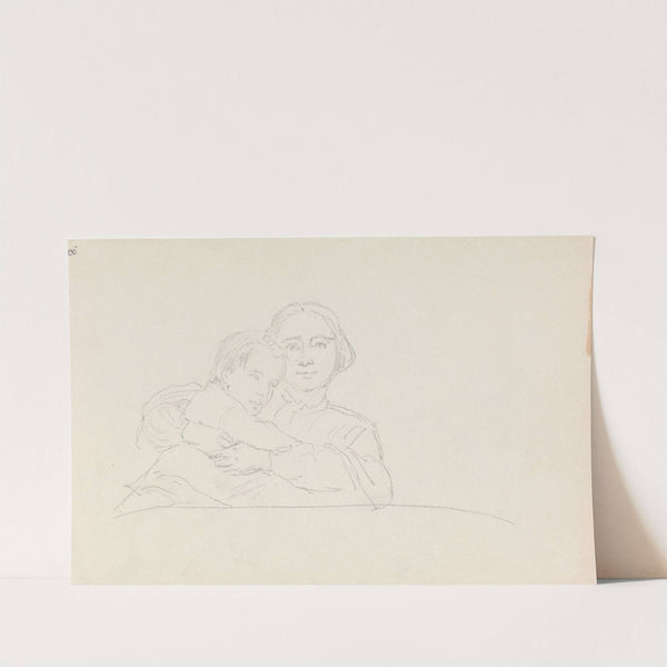 This minimalist line drawing captures the tender moment of "Mor og barn" (Mother and Child) by Adolph Tidemand. The artwork features a mother gently leaning in to embrace her child, their heads close together in an intimate pose. The mother's...