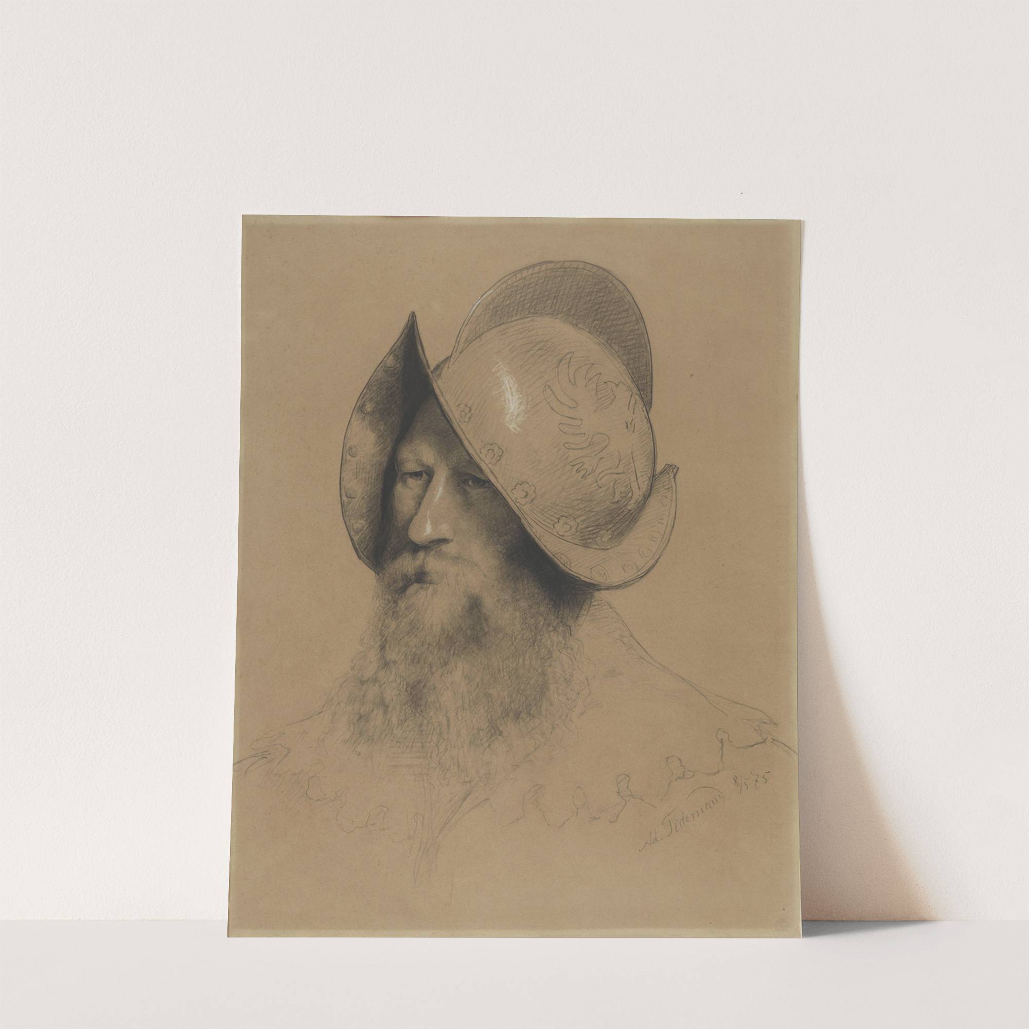 This sepia-toned etching showcases "Officer (1875)" by the renowned artist Adolph Tidemand. The piece features a finely detailed portrait of an older man with a solemn expression. He has a thick, full beard and is adorned in period-specific attire that...