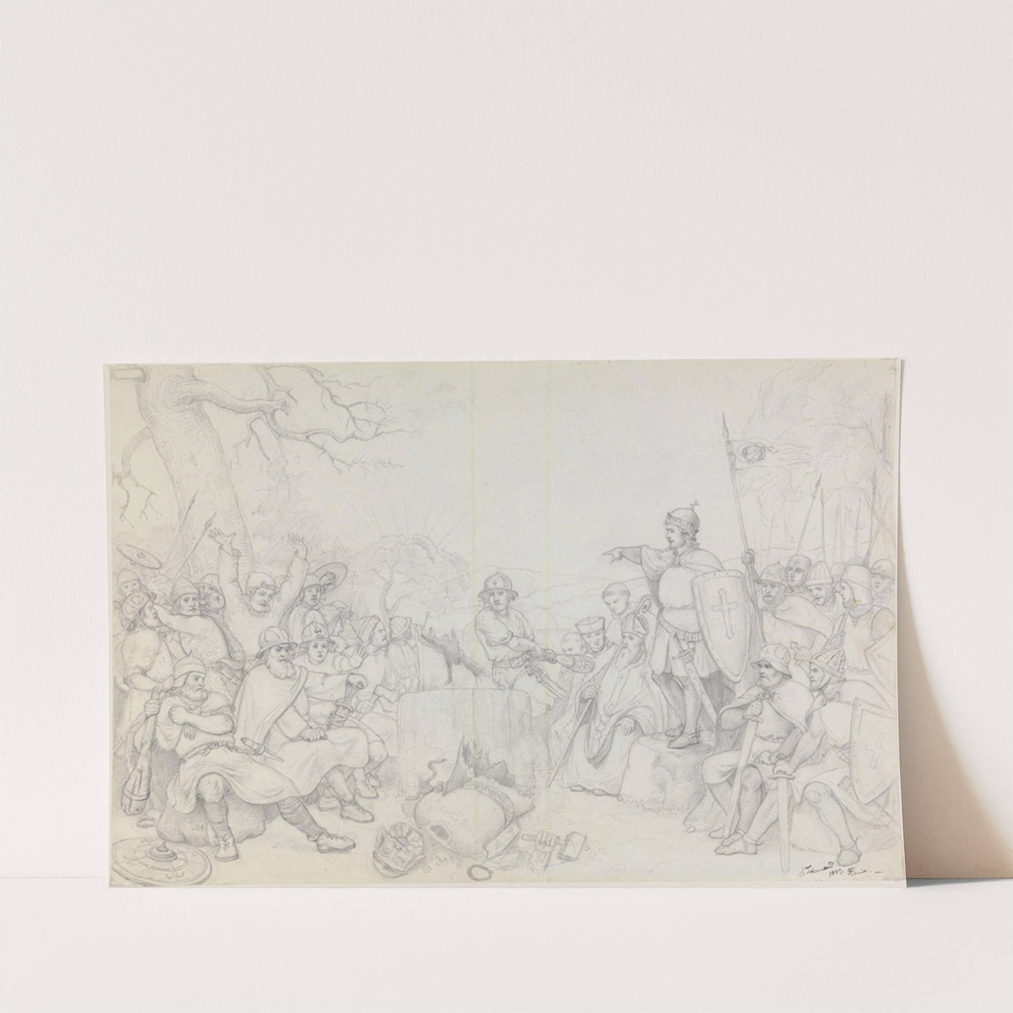 This black-and-white sketch features a detailed historical scene titled "Olav den Hellige Omstyrter Tors Bildet på Hundorp" by Adolph Tidemand. The drawing depicts a dynamic, crowded composition filled with various figures dressed in period attire, capturing a moment of lively...