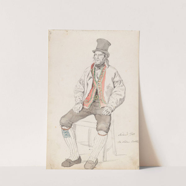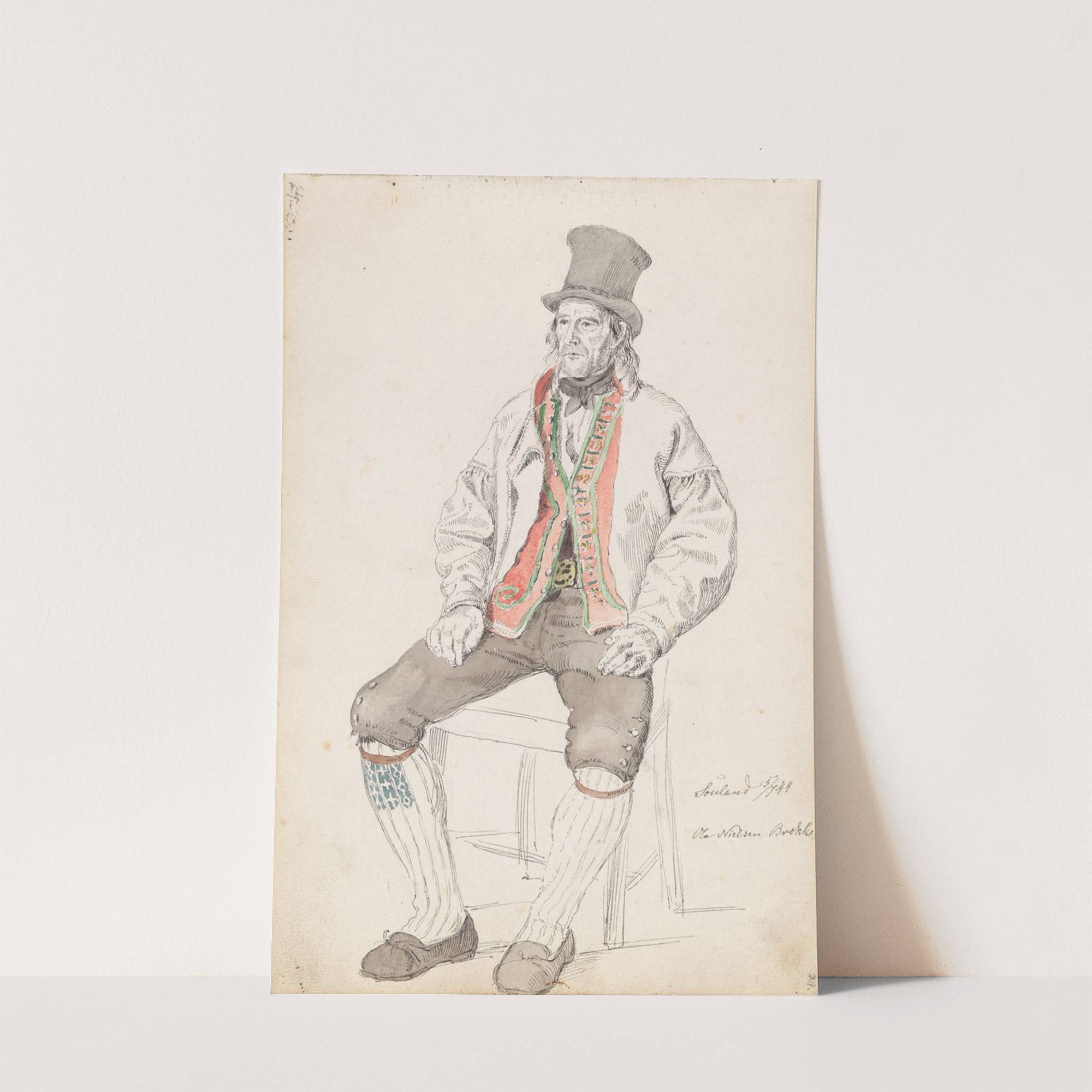 This striking watercolor illustration captures the essence of 19th-century fashion with remarkable detail and precision. The subject is a seated man dressed in period attire, exuding an air of historical sophistication. He wears a tall, black top hat that adds...