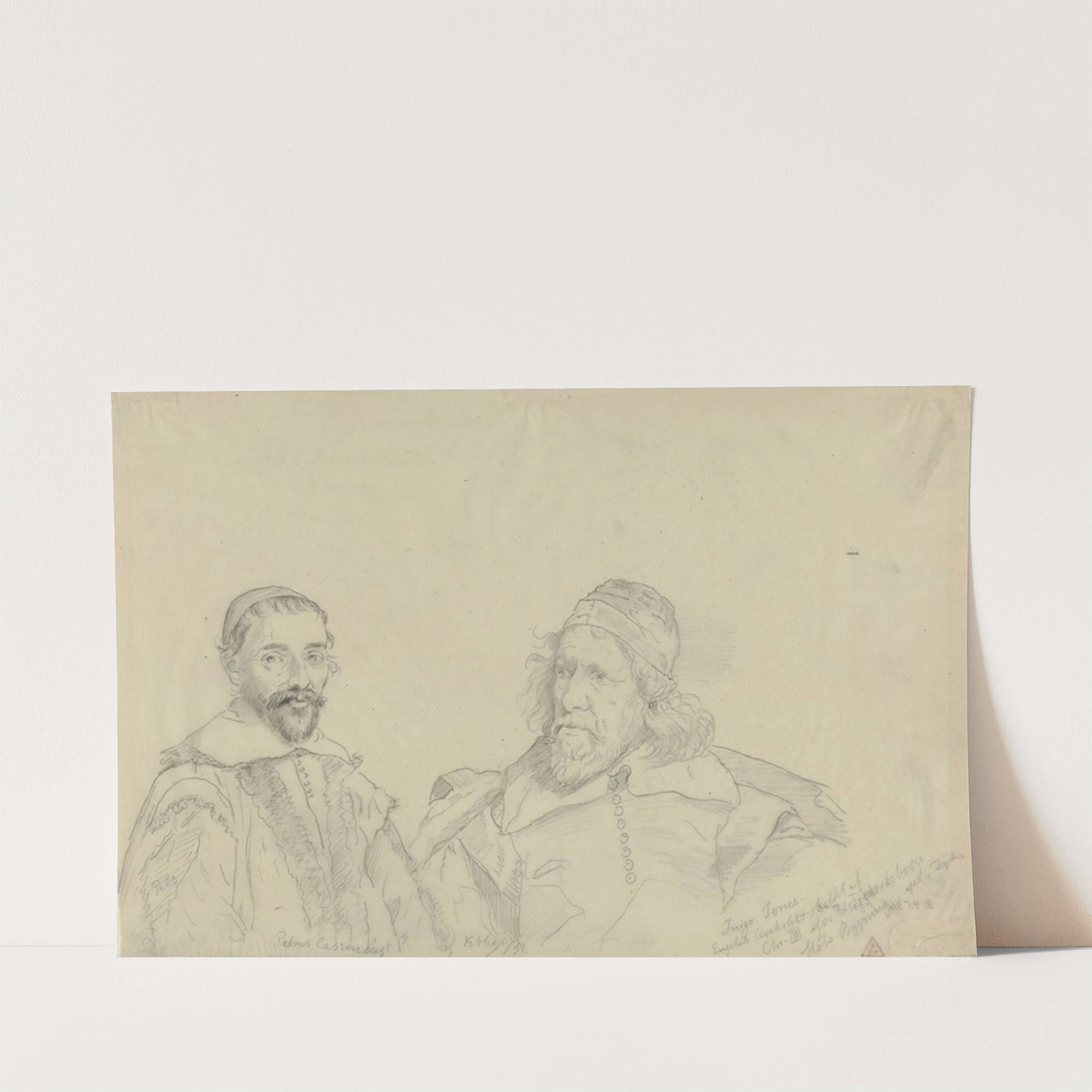 This delicate pencil drawing features two male figures from the 19th century, rendered with meticulous detail. On the left stands a younger man with a neatly trimmed beard and mustache. He wears a simple cap and a high-collared shirt adorned...