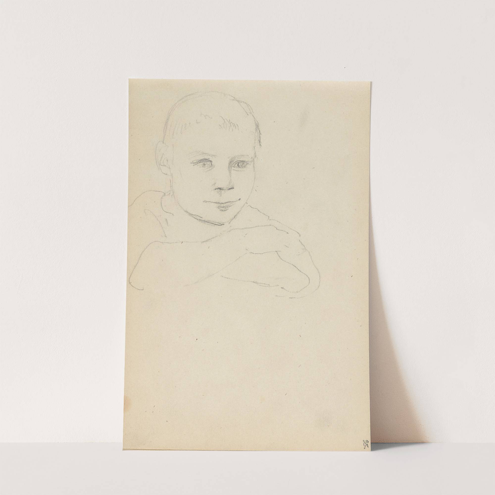 This minimalist pencil sketch by Adolph Tidemand titled "Portrett av gutt" (1852) beautifully captures the essence of a young man's portrait in delicate, monochromatic lines. The subject is depicted with short hair and a slight smile, conveying a sense of...