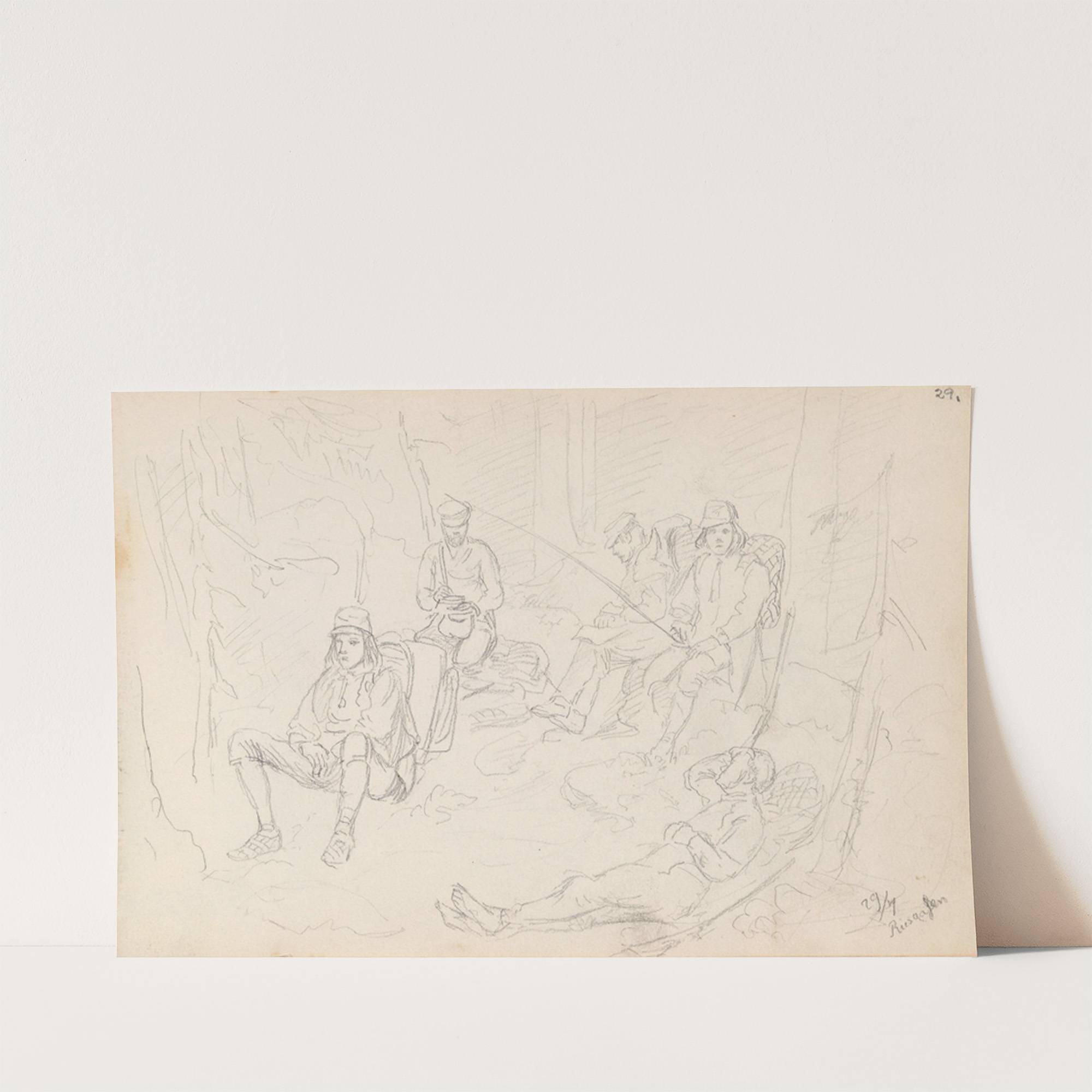 This is a delicately drawn sketch titled "Rast på Risåsen" (1852) by Adolph Tidemand, showcasing a serene forest scene with six figures seated among tall trees. The monochromatic line art features fine, flowing lines that create a sense of gentle...