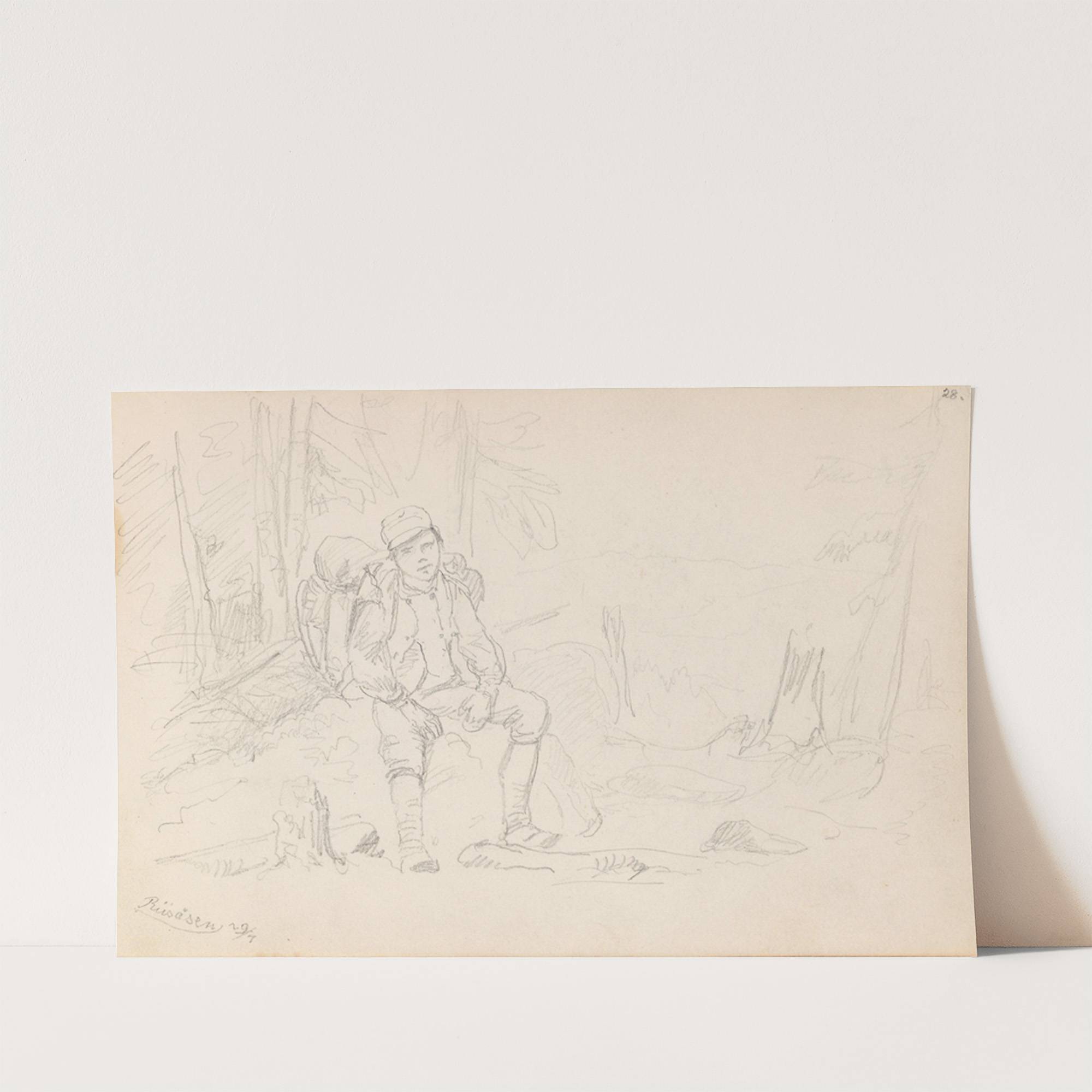 This line drawing features "Rast på Risåsen" (1852) by Adolph Tidemand. The artist employs delicate pencil lines to depict two hikers resting in a forest setting. The figure on the left sits slightly hunched, leaning against a tree trunk with...