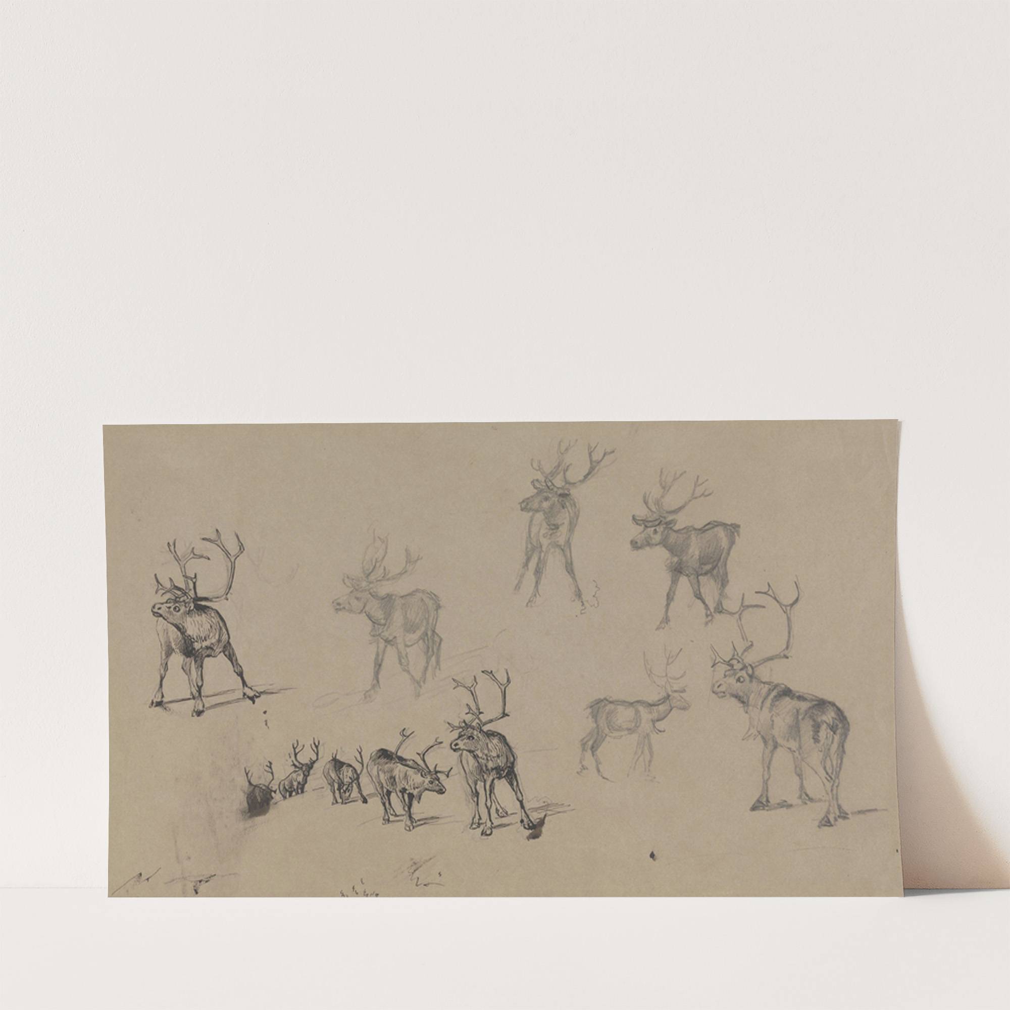 This art print features a series of pencil sketches depicting reindeer in various poses across a beige-toned background. The artist has skillfully captured the natural elegance and intricate antlers of the deer, showcasing both individual animals and small groups within...
