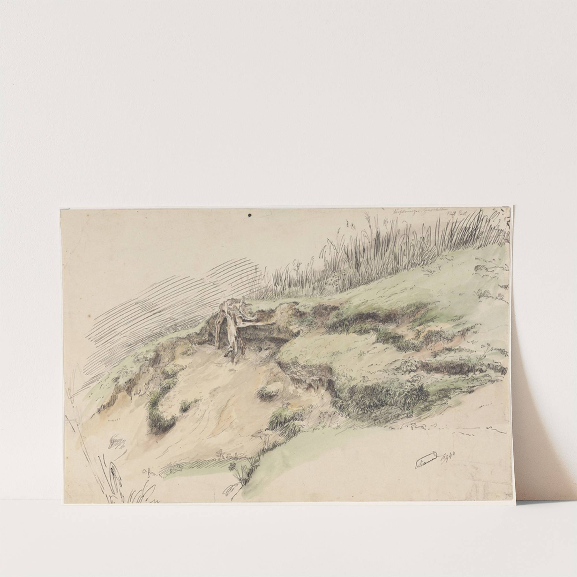 This art print titled "Sandskren (1844)" by Adolph Tidemand features a serene landscape illustration rendered in delicate pencil and watercolor tones. The scene depicts a gentle, sunlit hillside with sparse vegetation, including tufts of grass and small shrubs. A solitary...