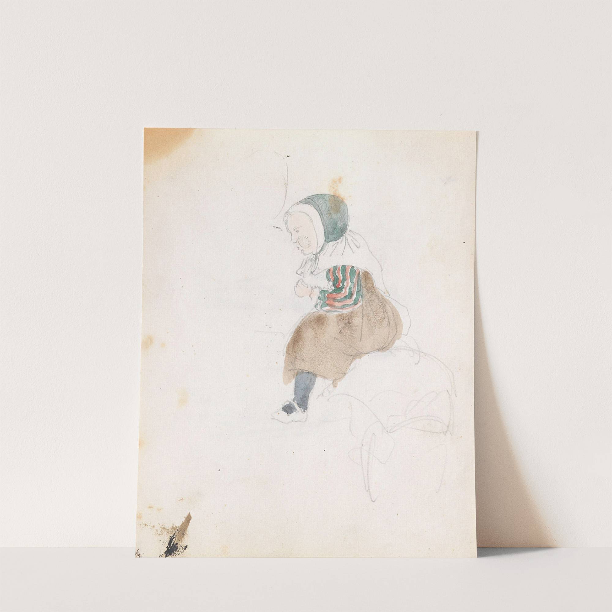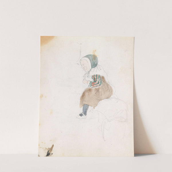 This art print features "Sittende barn" by Adolph Tidemand, a beautifully rendered watercolor painting from 1848. The subject is a young child, depicted with delicate, subtle brush strokes that highlight the softness of youth. The child's head is slightly turned...