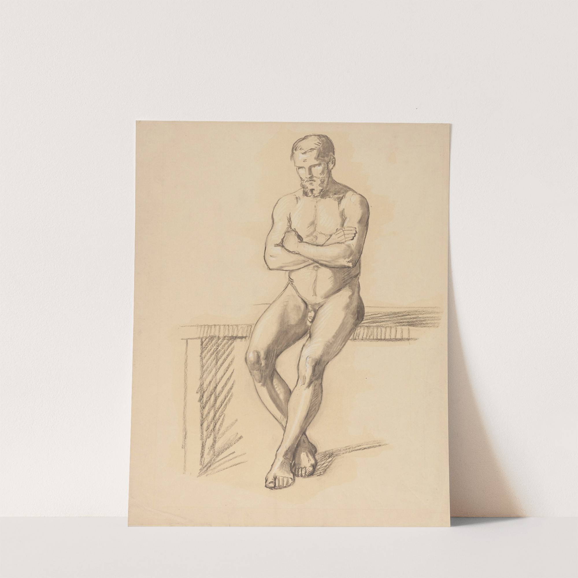 This art print features "Sittende mannsskikk" (Seated Man) by the renowned artist Adolph Tidemand, created in a classic pencil sketch style. The subject is a muscular, adult male, seated with his legs crossed and arms folded comfortably over his chest....