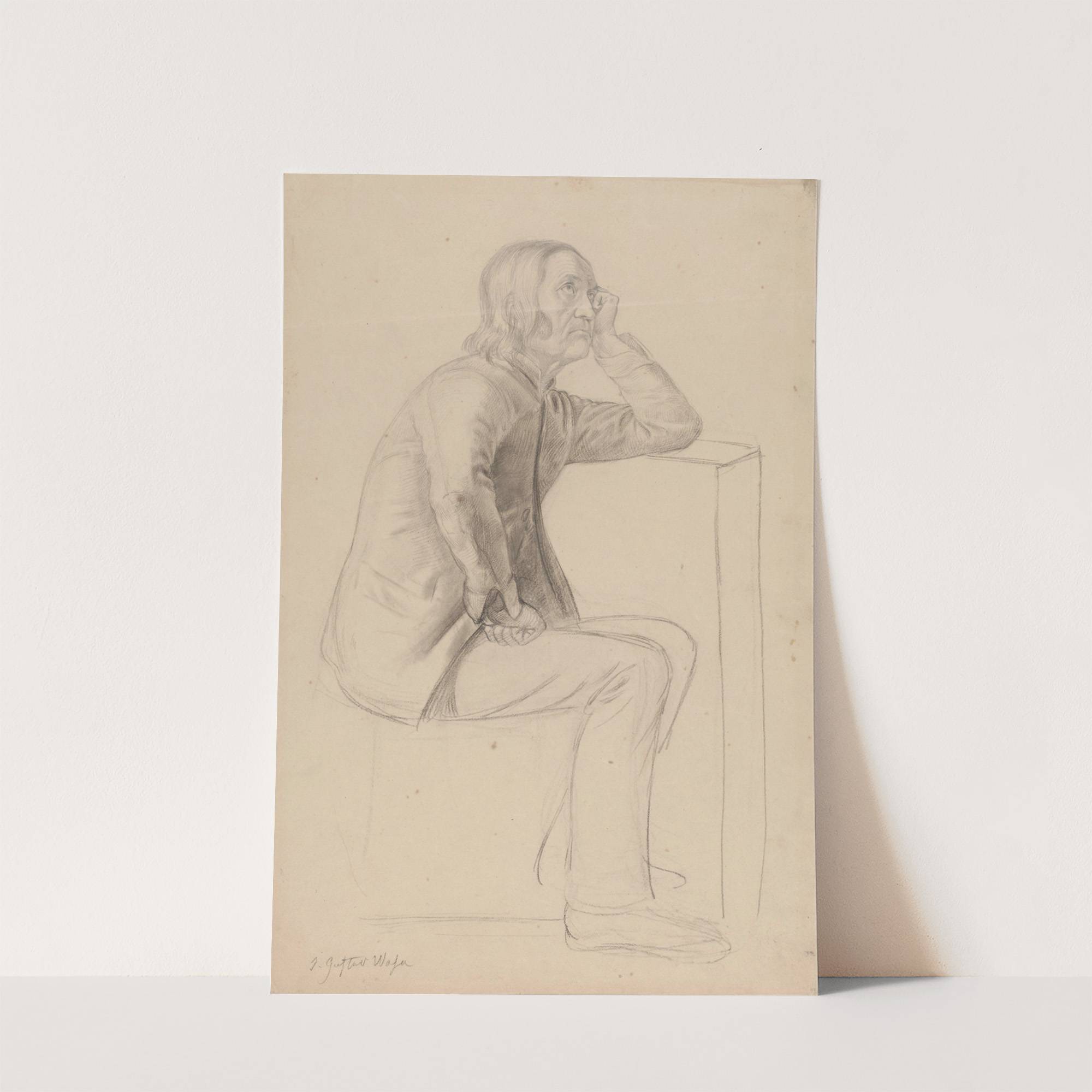 This is a meticulously detailed pencil drawing titled "Sitting Man" by the artist Adolph Tidemand. The subject of the drawing is an elderly man with long, slightly wavy hair and a beard. He is seated on a simple rectangular block,...