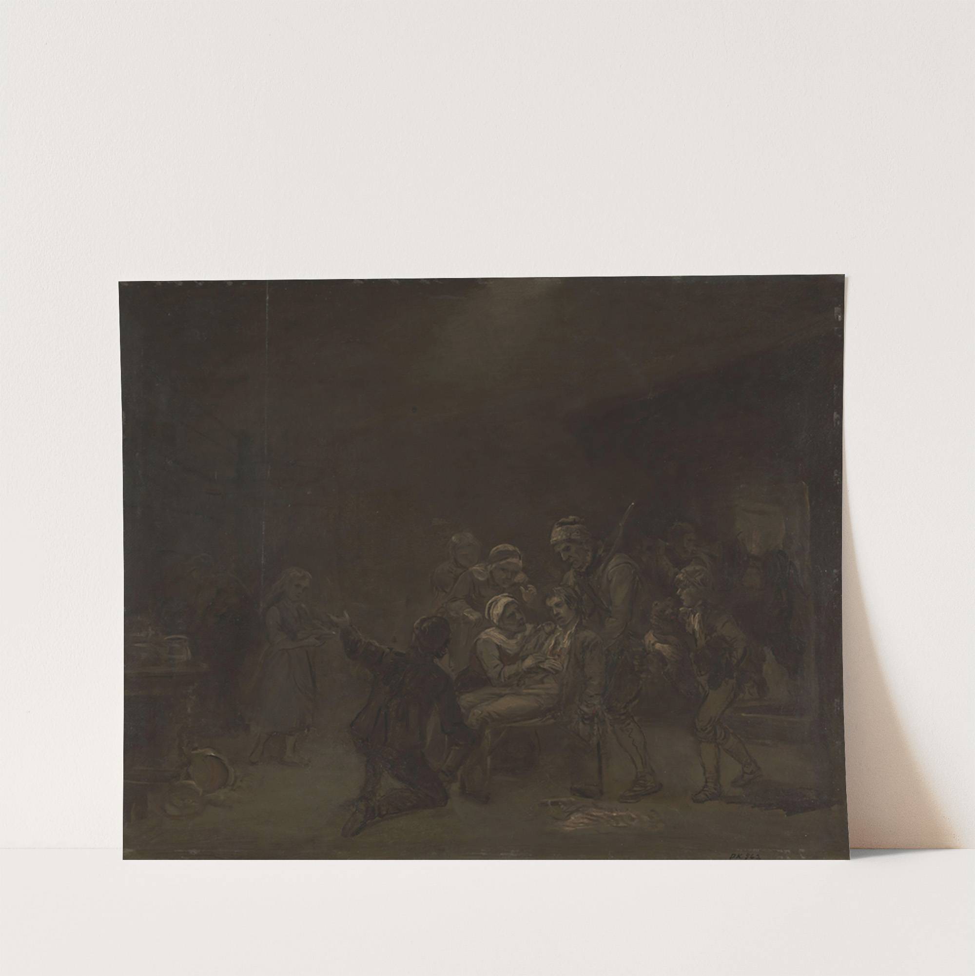 This artwork is a dark, somber painting titled "Sketch for The Return of the Bear Hunter" created by Adolph Tidemand in the mid-19th century. It portrays a grim and emotional scene set in a dimly lit room. Central to the...