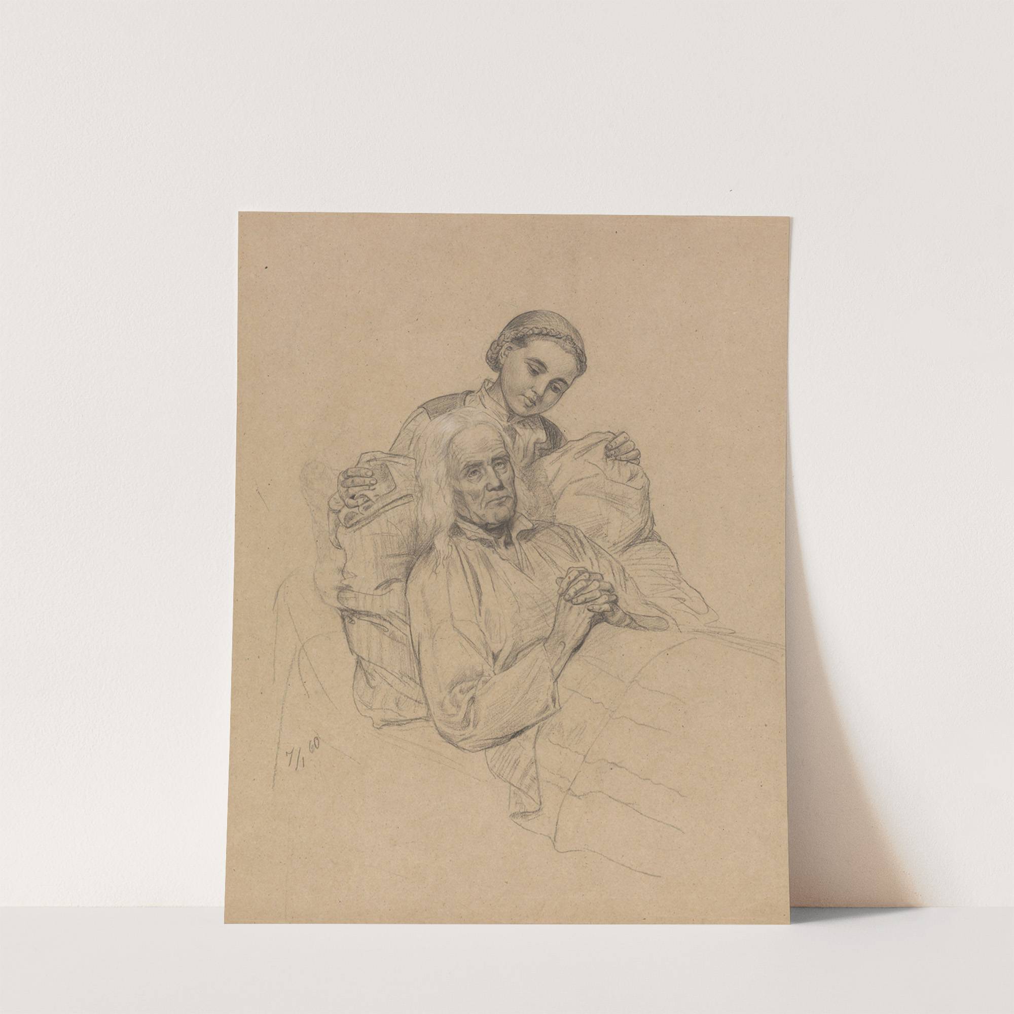 This exquisite pencil drawing by Adolph Tidemand captures a poignant moment of tenderness between two figures. An elderly man with long white hair and a weary expression lies in bed, his hands gently clasped together. His weathered face hints at...