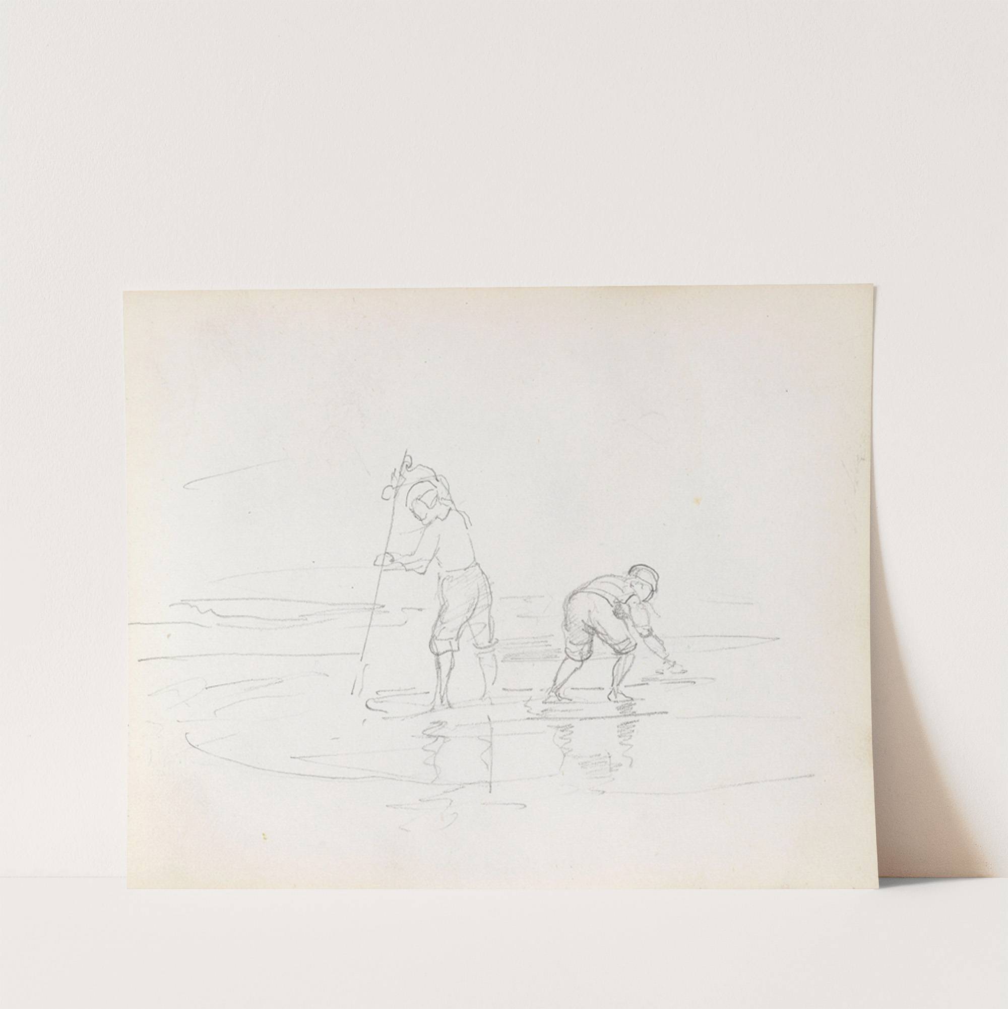This art print features "Spydfiske (1865)" by Adolph Tidmand, a delicate line drawing that captures a serene coastal scene with fine, minimalist details. The composition showcases two figures: one standing on the left holding a fishing rod, and another bending...