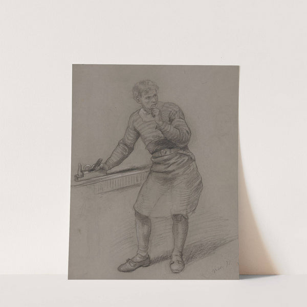 This monochromatic pencil drawing titled "Standing Young Man with a Planer" by Adolph Tidemand showcases an intricate portrait of a young man in a contemplative pose. He leans against a low counter or table, his right elbow resting on it...