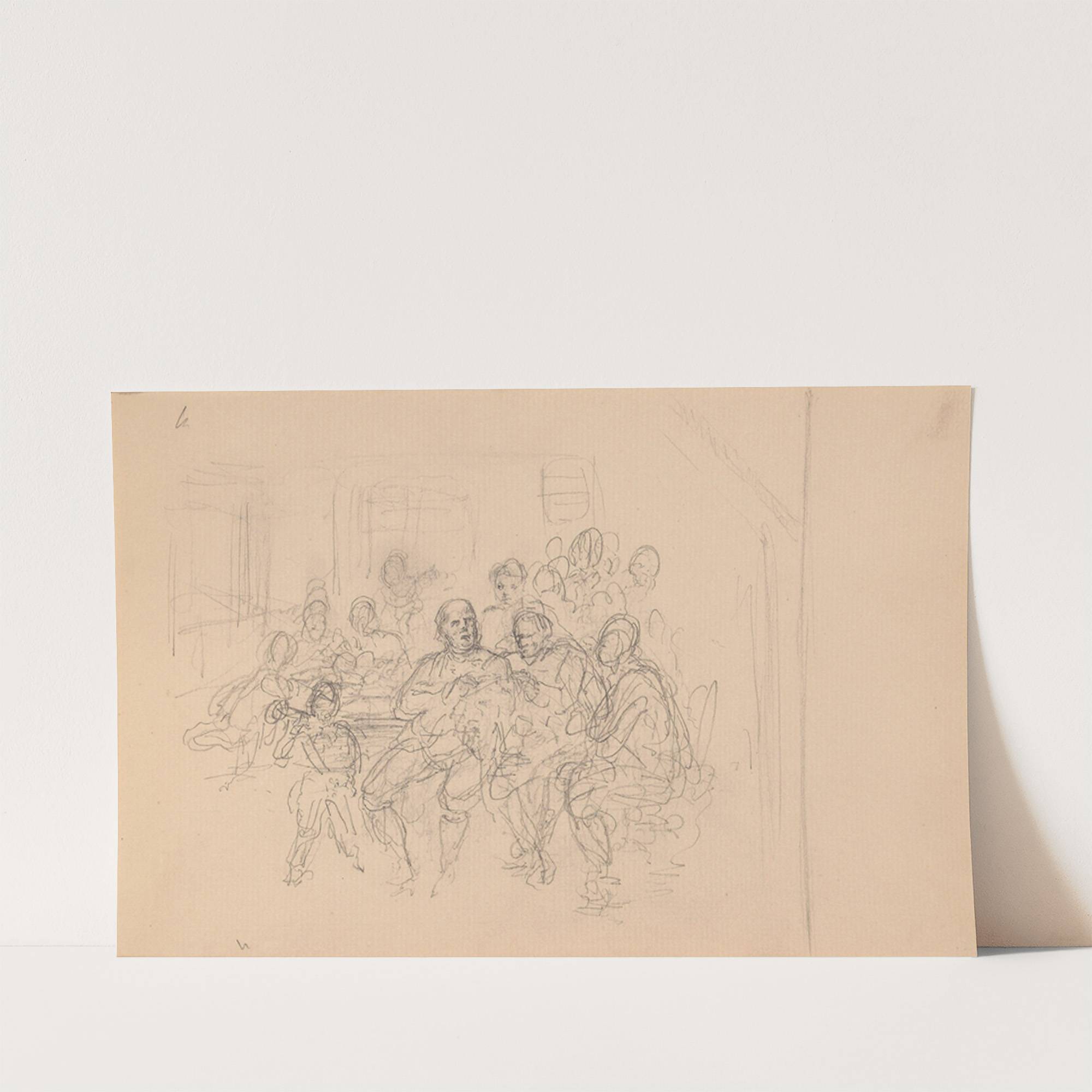 This is a delicate pencil sketch titled "Stortingsmannens hjemkomst" by Adolph Tidemand, created in 1857. The artwork depicts a lively group of people engaged in animated conversation and activity within what appears to be an indoor setting. The characters are...