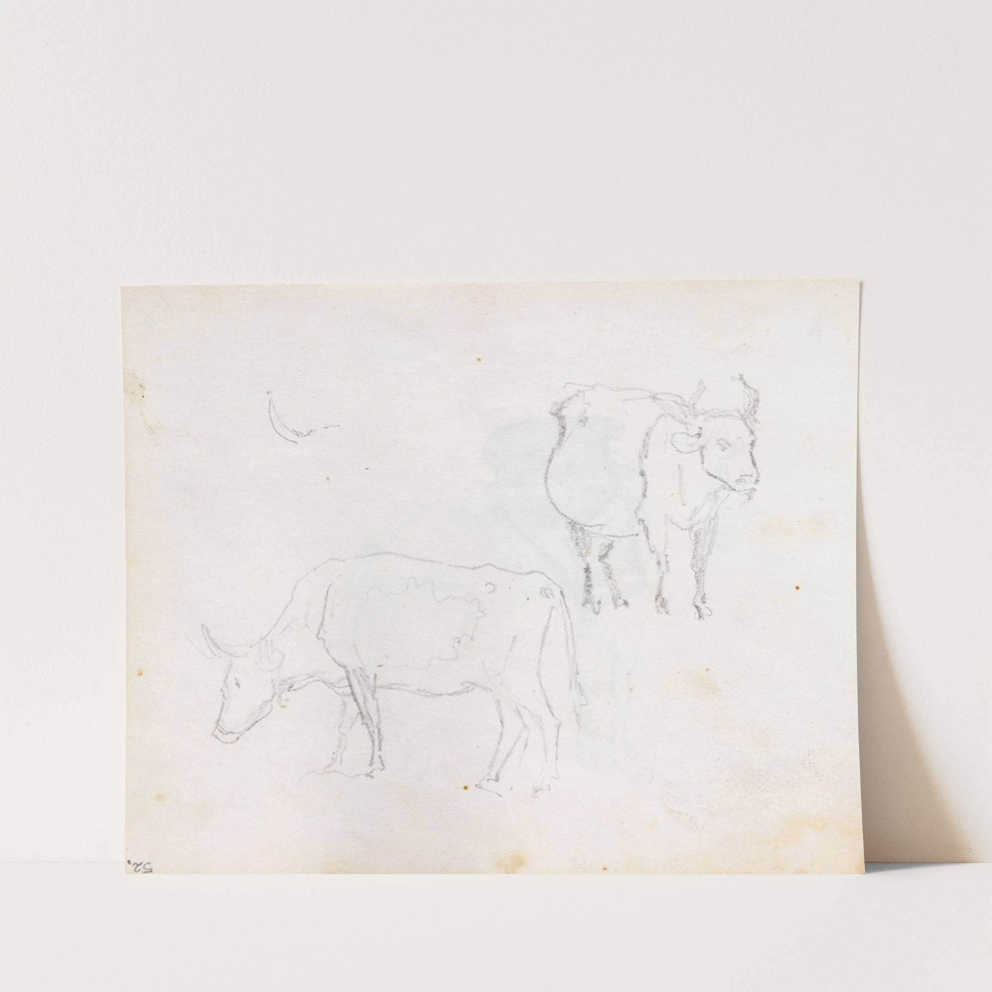 This artwork is titled "Studier av kuer" (Study of Horses) by the renowned artist Adolph Tidemand, created in 1848. The piece showcases a delicate, monochromatic line drawing of two horses standing side by side against a plain white background. Each...
