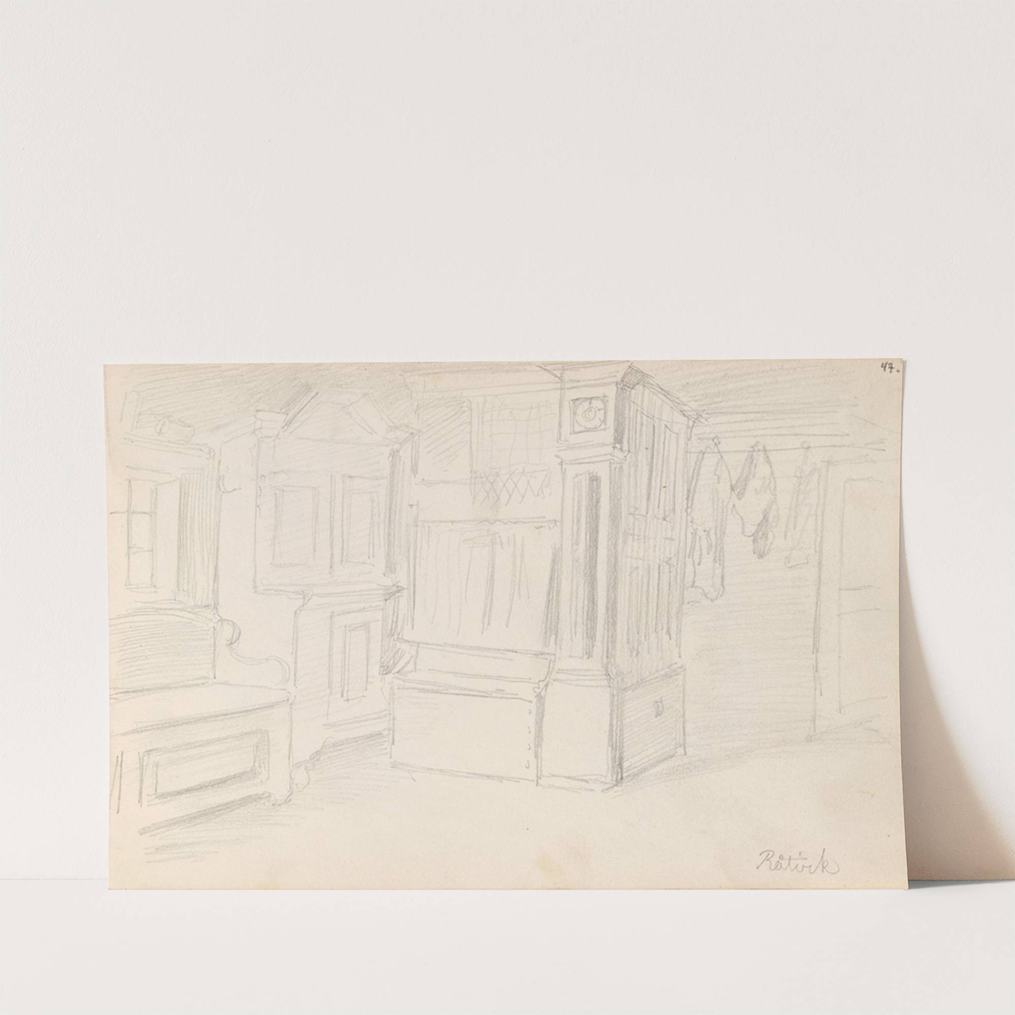 This art print features "Stueinteriør, Rättvik (1852)" by Adolph Tidmand, rendered in delicate pencil sketches on white paper. The composition captures the interior of a rustic, wooden house with an emphasis on natural light and shadow. On the left side...