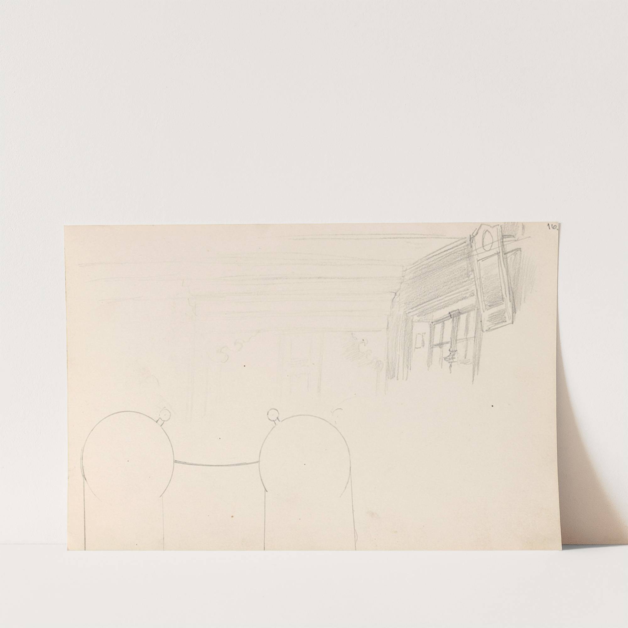 This minimalist line drawing captures the essence of "Geometrisk figur (1857)" by Adolph Tidmand, characterized by its sparse yet effective use of lines. The right side of the canvas features a meticulously outlined wooden building facade with detailed windows and...