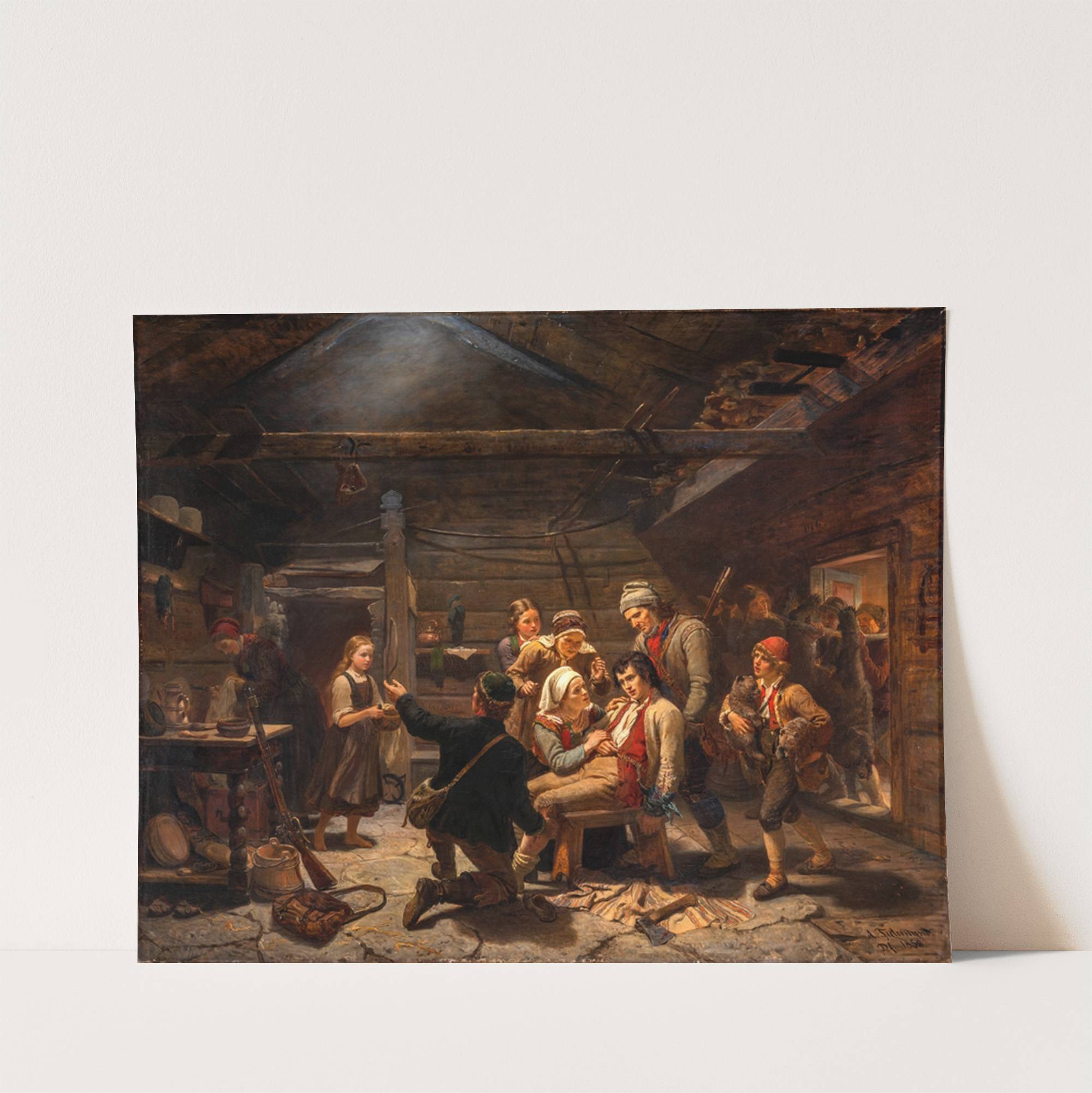 This captivating artwork titled "The Wounded Bear Hunter" by Adolph Tidmand captures a deeply emotional scene within a rustic, dimly lit wooden cabin. The warm hues of brown and amber dominate the composition, with a soft spotlight illuminating the central...