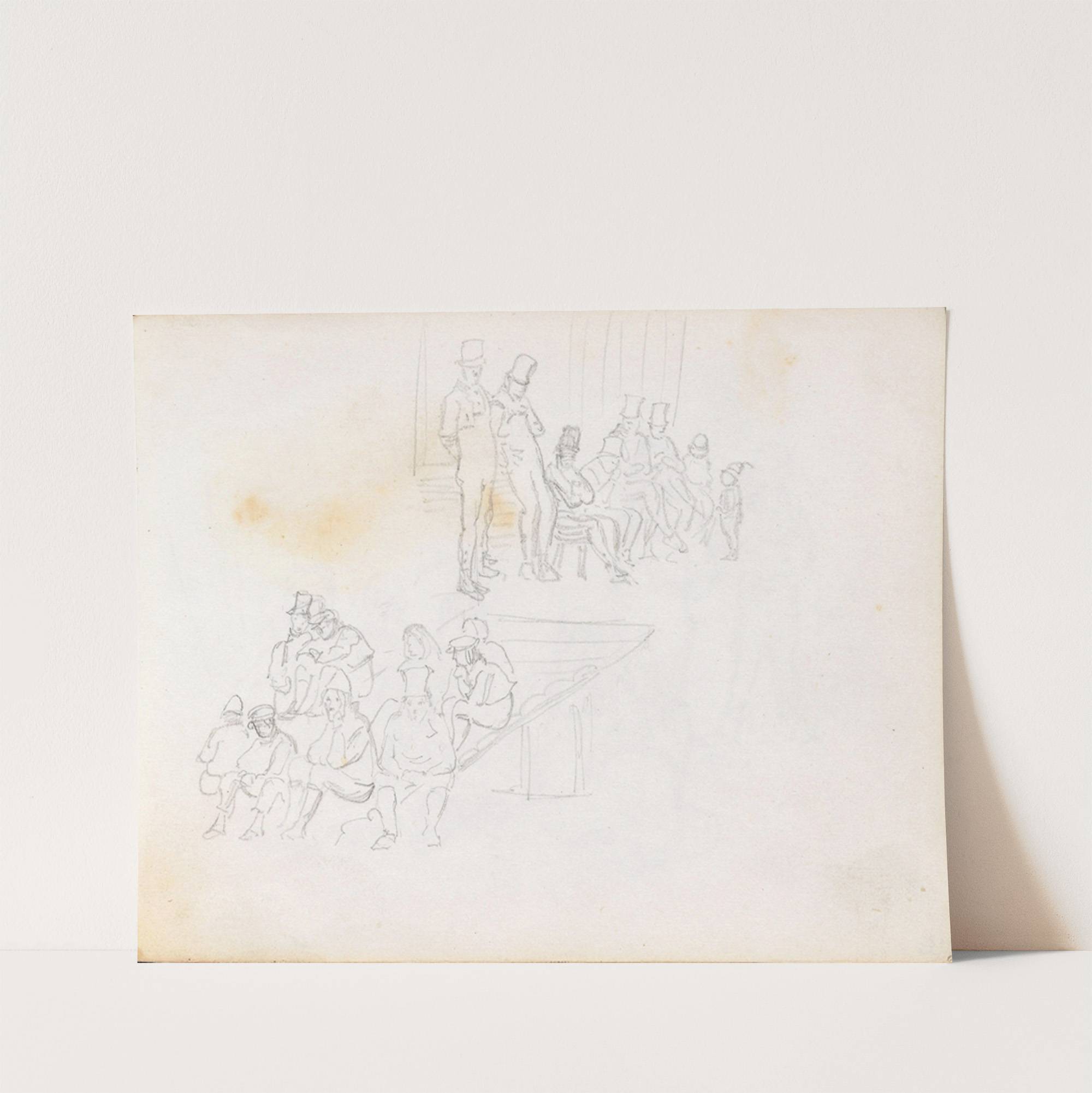 This artwork is "To figurgrupper (1848)" by Adolph Tidemand, a delicate line drawing rendered in a minimalist style. The composition features loosely interconnected groups of figures, suggesting an informal gathering or social interaction without detailed facial expressions or specific identities....