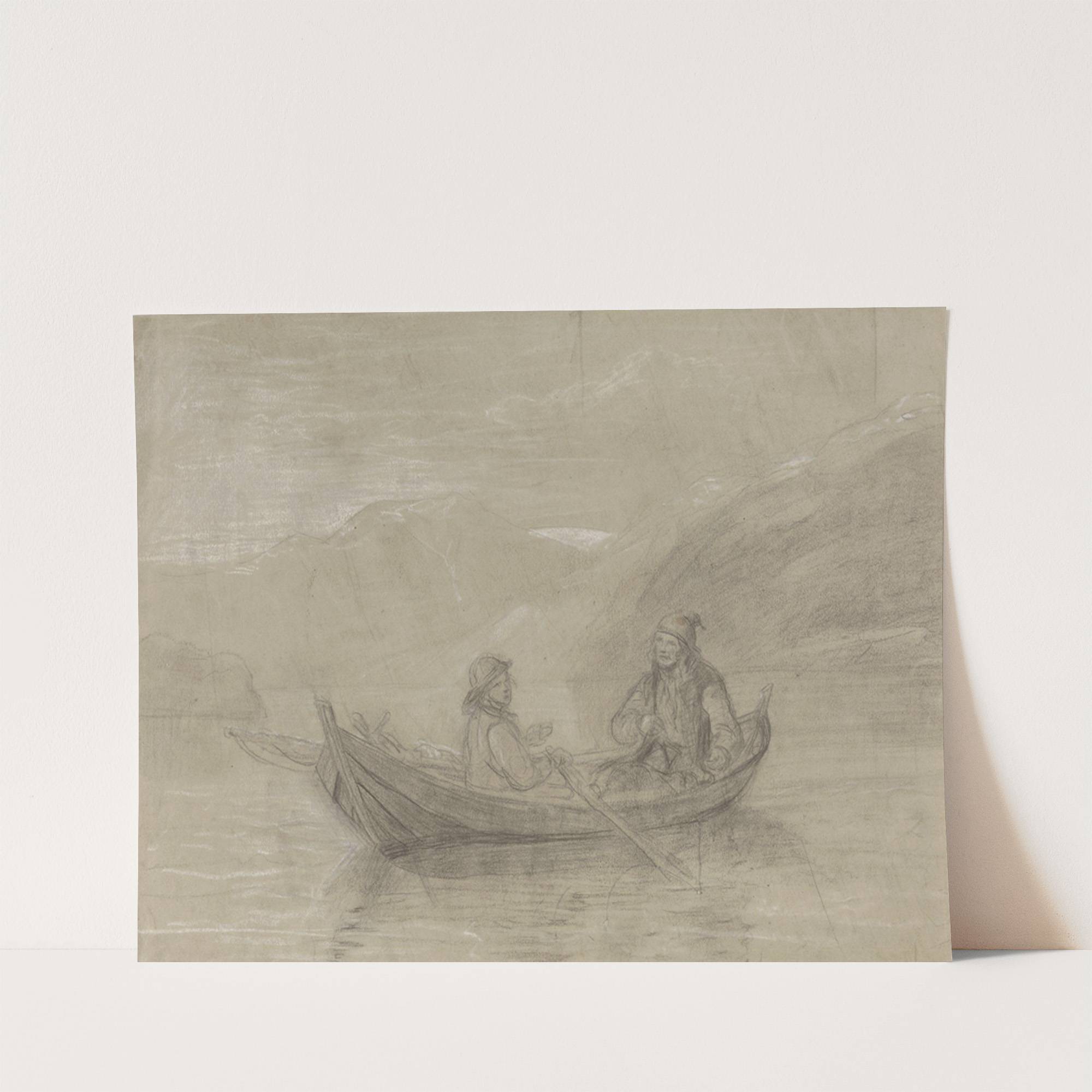 This beautiful pencil sketch captures the serene scene of two figures in a traditional wooden boat on calm waters, titled "To Fiskere i Båt" by Adolph Tidemand. The soft grayscale tones evoke a timeless quality, with meticulous attention to detail...