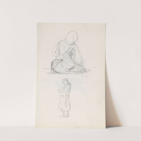 This sketch captures two tender moments between a woman and child, rendered in delicate pencil lines. The top half of the image features an adult woman seated on the floor, her head slightly bowed as she gently cradles a small...