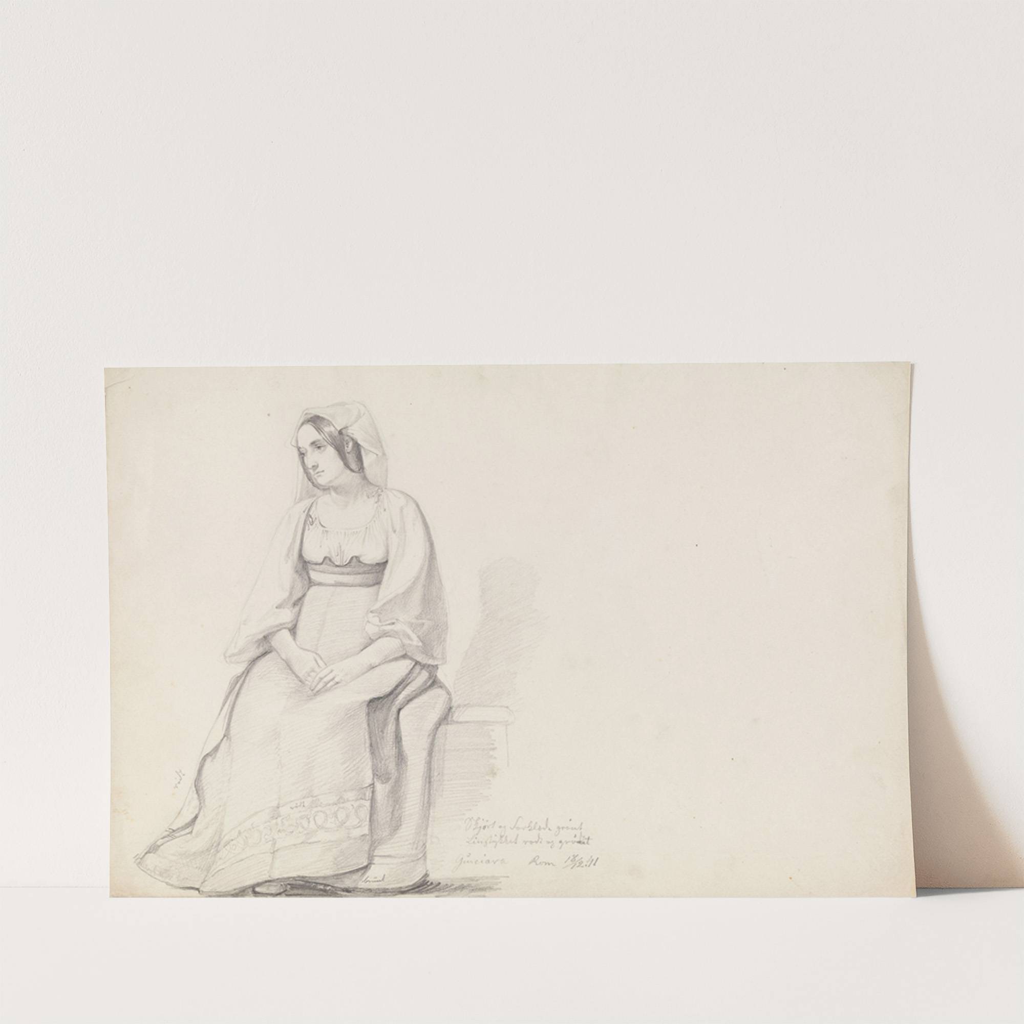 This elegant art print captures the delicate beauty of "Ung kvinne, Roma" by Adolph Tidemand, a masterpiece from 1841. The monochromatic sketch features a young woman seated gracefully on a bench, her head slightly tilted to the side as she...