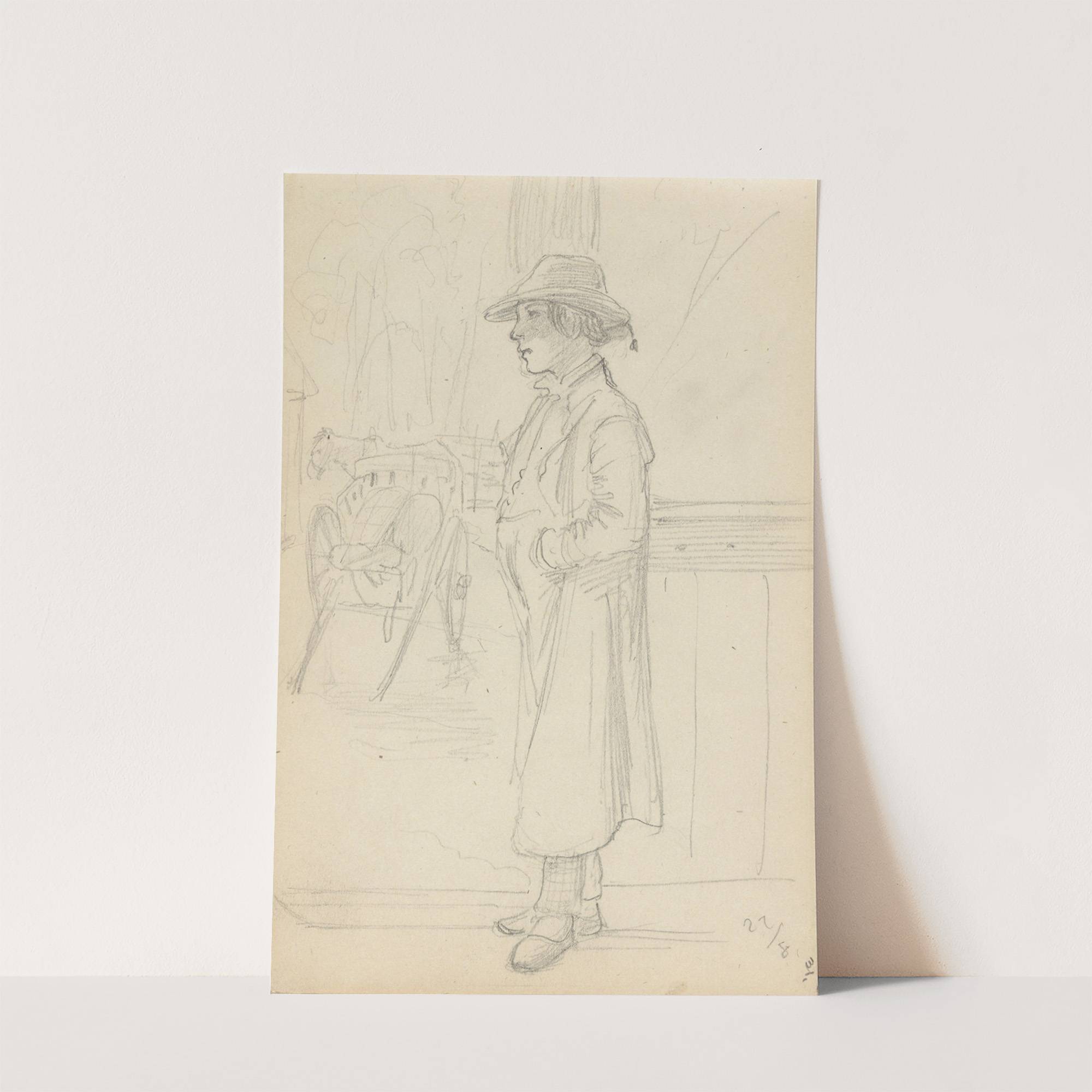 This charming pencil sketch features a side profile of a man standing in what appears to be an indoor setting, possibly a shop or café. He is dressed in mid-19th century attire, including a long, double-breasted coat that reaches down...