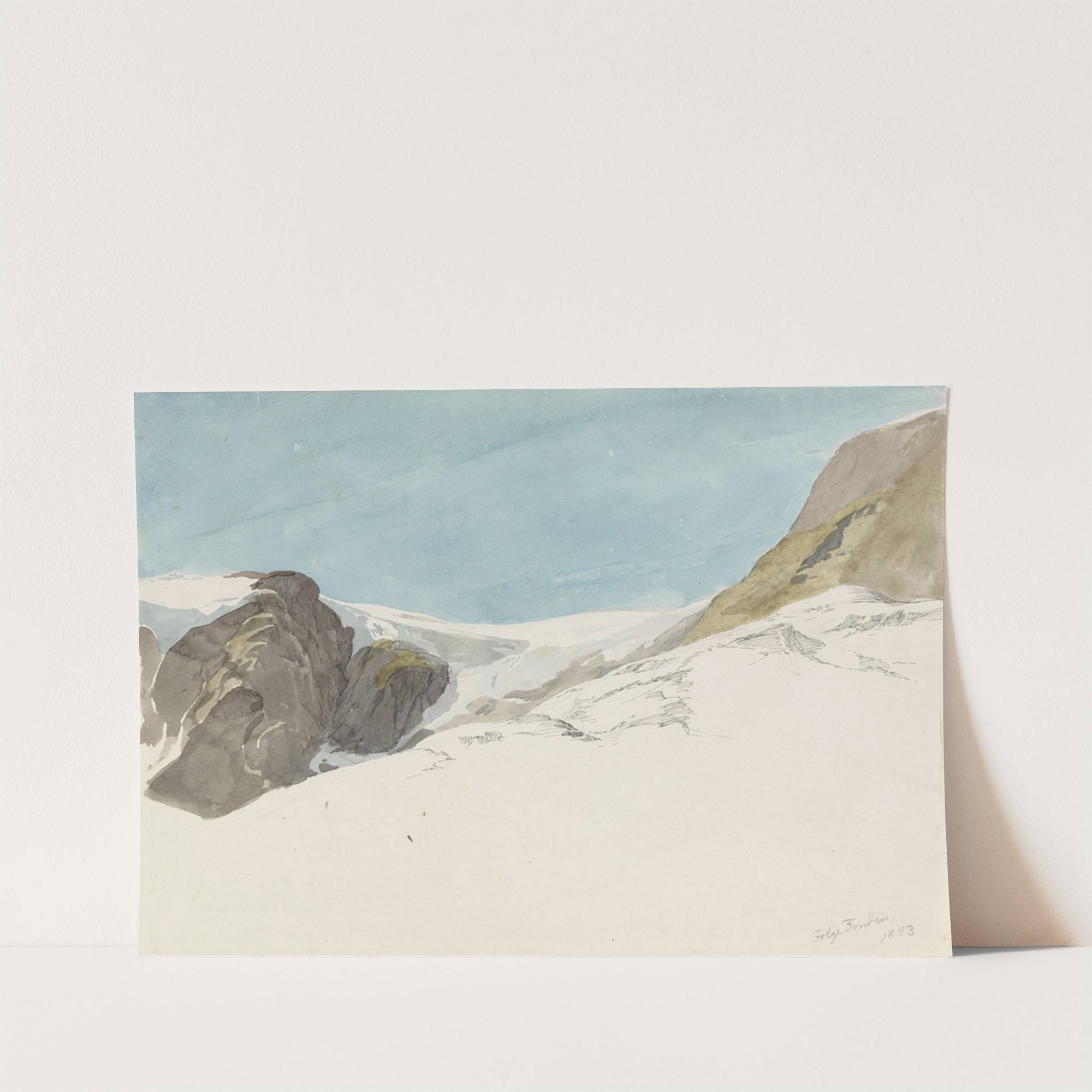 This captivating watercolor painting by Adolph Tidemand showcases a serene mountain landscape with a striking contrast between rugged rock formations and pristine snow-covered ground. The composition features a cluster of dark gray rocks on the left, sharply detailed against a...