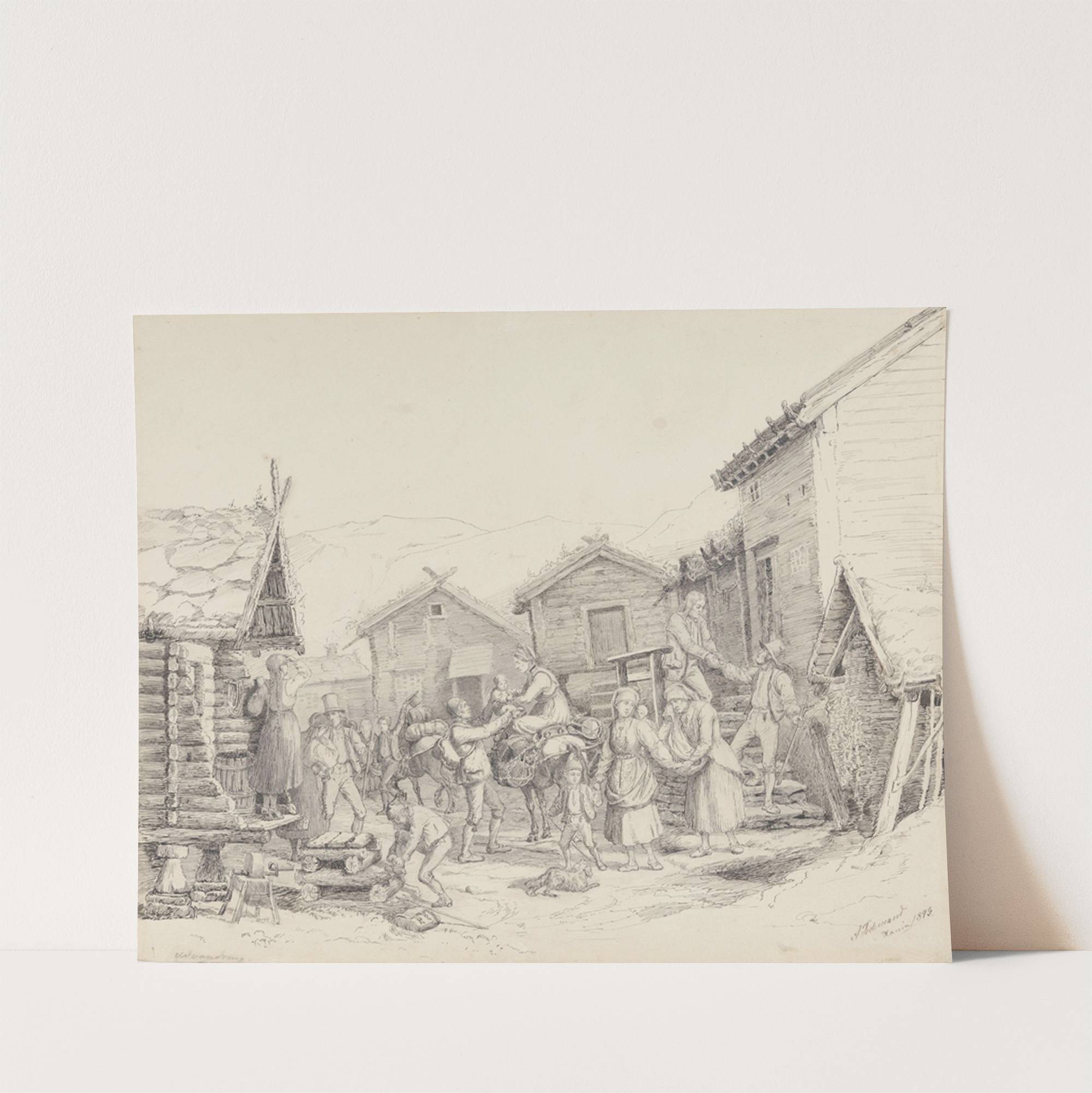 Experience the charm of rustic life with this beautifully detailed black-and-white sketch titled "Utvandring" by Adolph Tidemand. This artwork captures a lively village scene set in a quaint, rural setting. The composition features numerous figures engaged in everyday activities around...