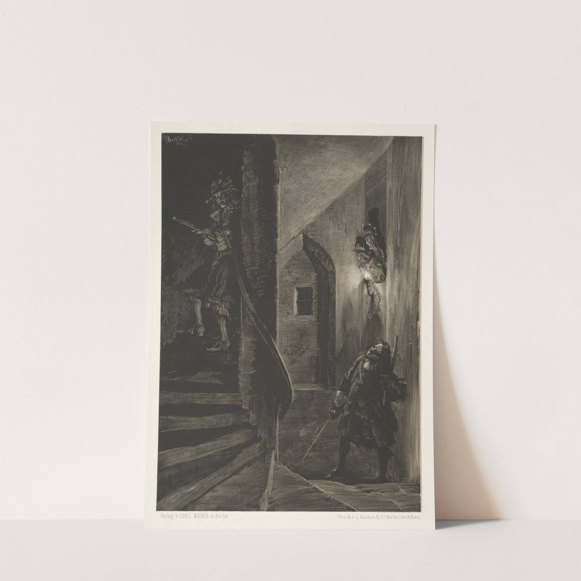 This monochromatic art print features "Essay on Stone with Brush and Scraper; Chase on the Winding Staircase" by Adolph von Menzel. The scene is dark and mysterious, captured in black and white with detailed, expressive brushwork that emphasizes the shadows...