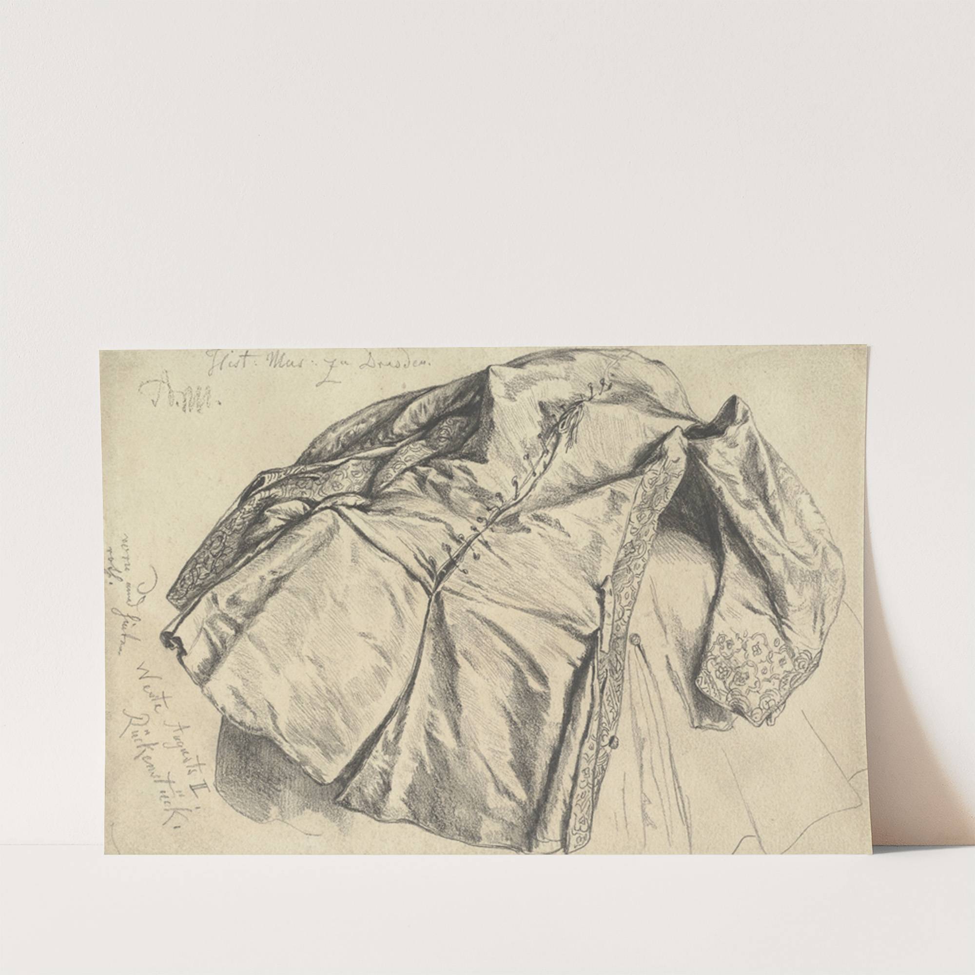 This elegant black-and-white sketch captures "The Vest of August the Strong" by Adolph von Menzel. Rendered with meticulous pencil work, this drawing showcases an intricately detailed historical garment in exquisite detail. The vest features richly patterned borders and a textured...