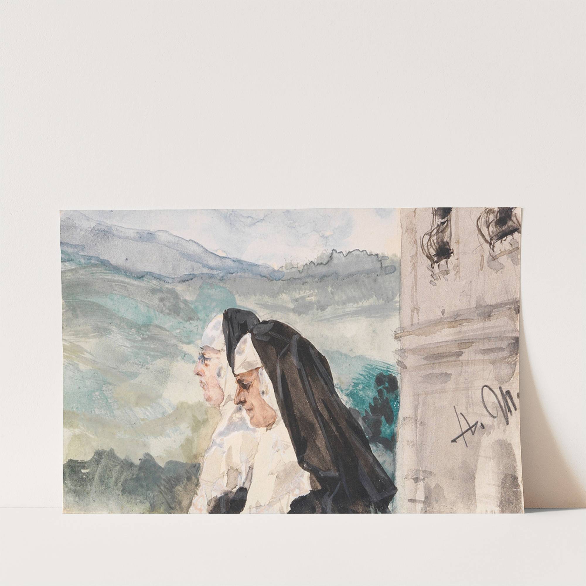 This art print features "Zwei Nonnen im Klosterhof" by Adolph von Menzel, showcasing two nuns in a serene outdoor setting. The painting employs a soft, impressionistic style with delicate brushwork and a muted color palette. The foreground highlights two nuns...