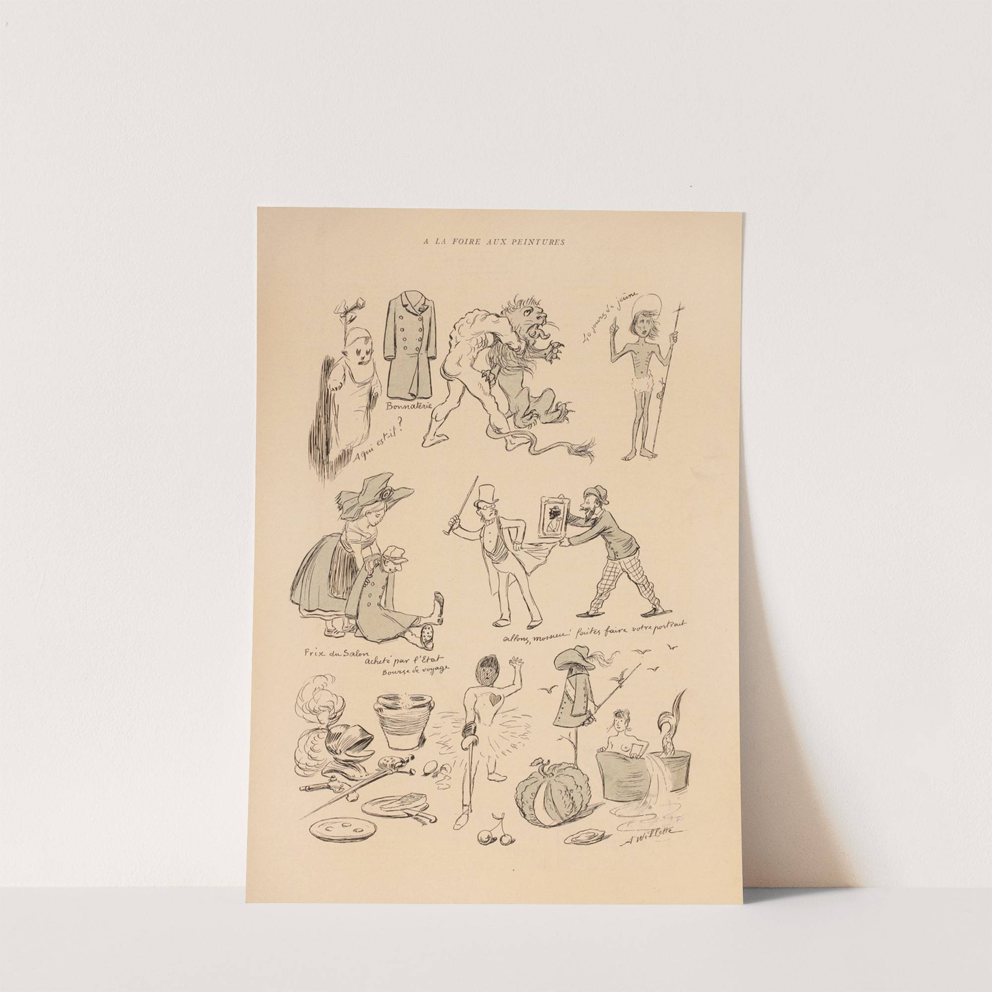 This art print features a charming black-and-white line drawing titled "A La Foire aux Peintures" by Adolphe Léon Willette, capturing whimsical scenes from an artist's market. The illustration is filled with playful vignettes and detailed characters in various humorous situations.In...