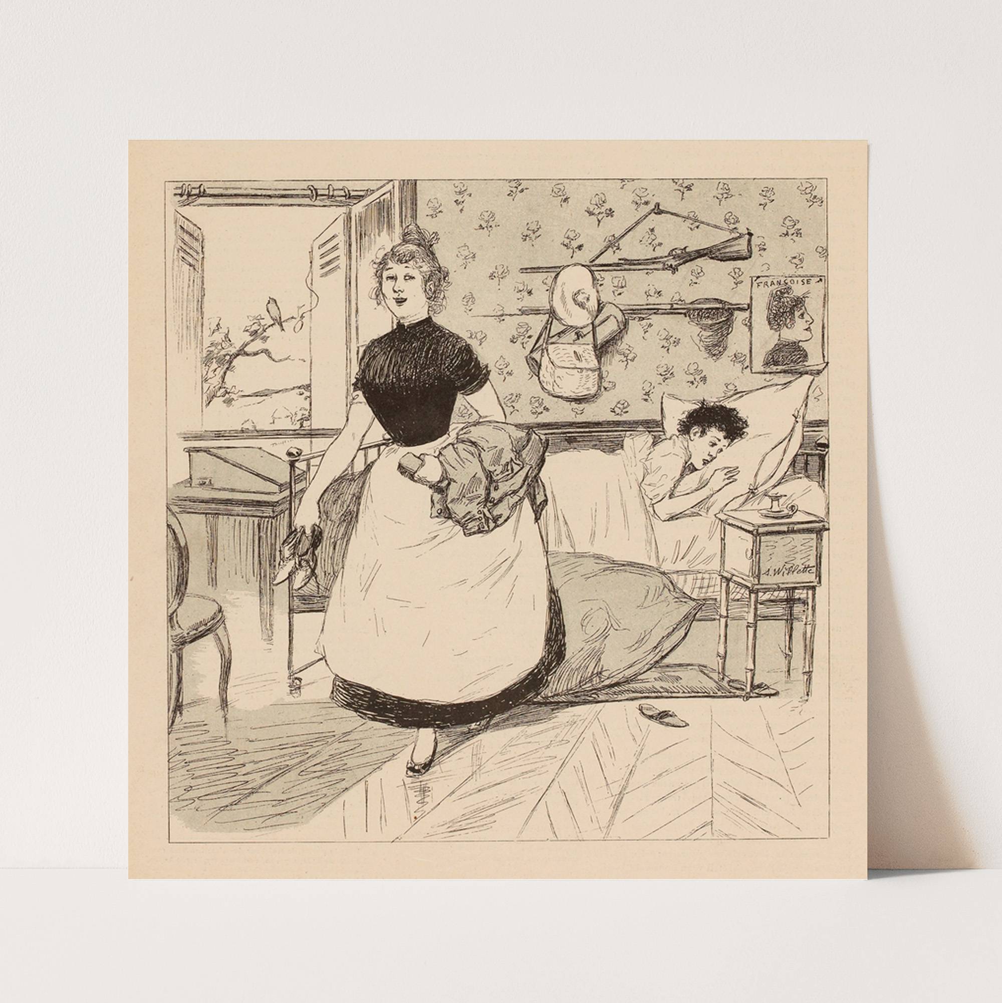 This charming black-and-white illustration features a Victorian-style domestic scene created by the artist Adolphe Léon Willette in his style called Méchant Je le dirai à maman. The central figure is a woman, depicted with a traditional hairstyle and wearing a...