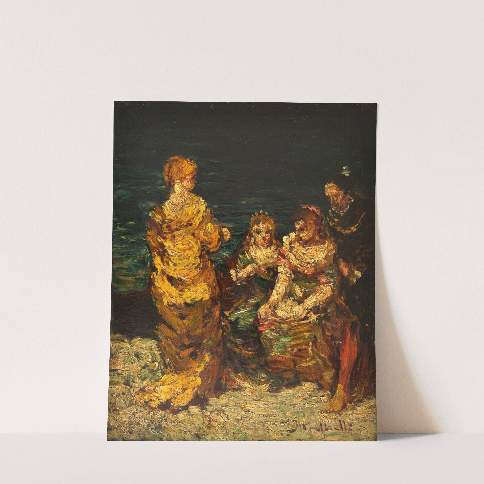 This vibrant impressionist painting titled "La conversation interrompue" by Adolphe Monticelli captures an intimate seaside moment with rich, dynamic brushstrokes that bring the scene to life. The composition features three individuals against a dark, almost black background that contrasts strikingly...
