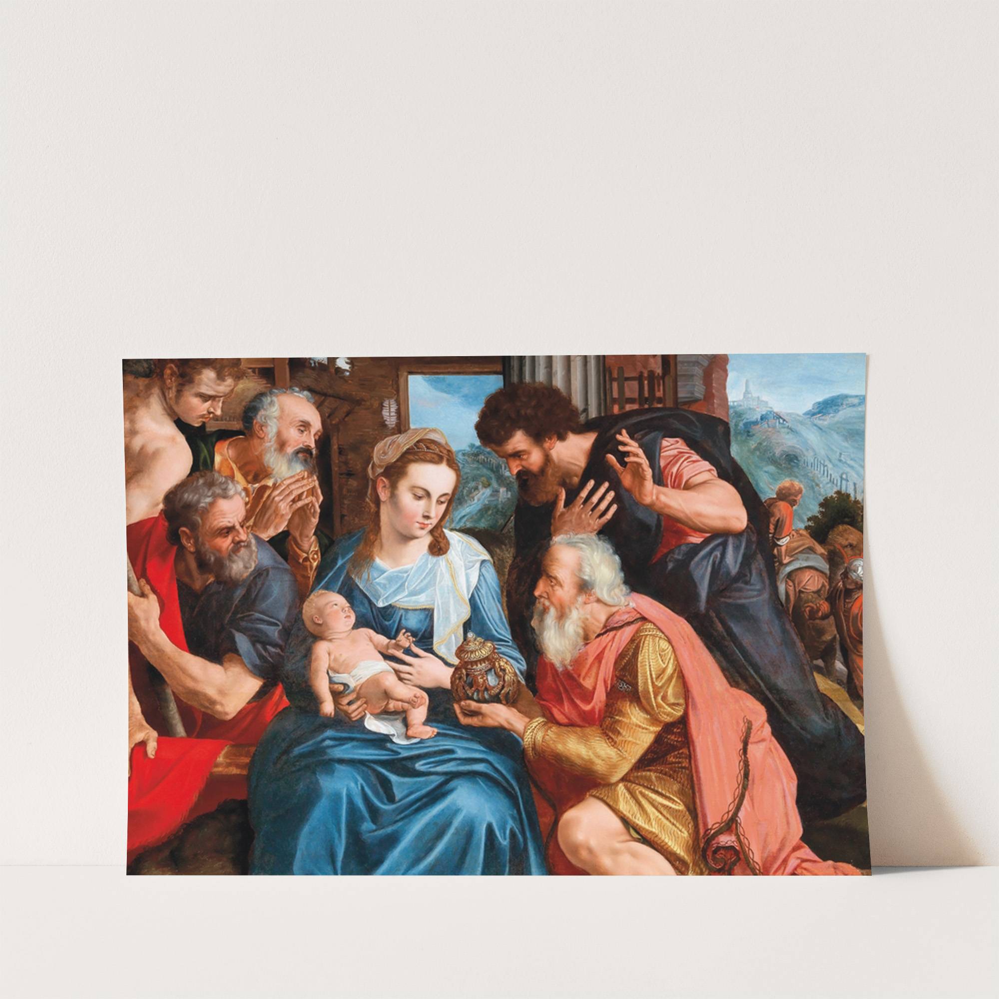 This beautifully rendered art print depicts "The Adoration of the Magi" by Adriaen Thomasz. At the center, a serene Virgin Mary, dressed in a blue cloak with a white headscarf and a delicate blue dress, gazes lovingly at her newborn...