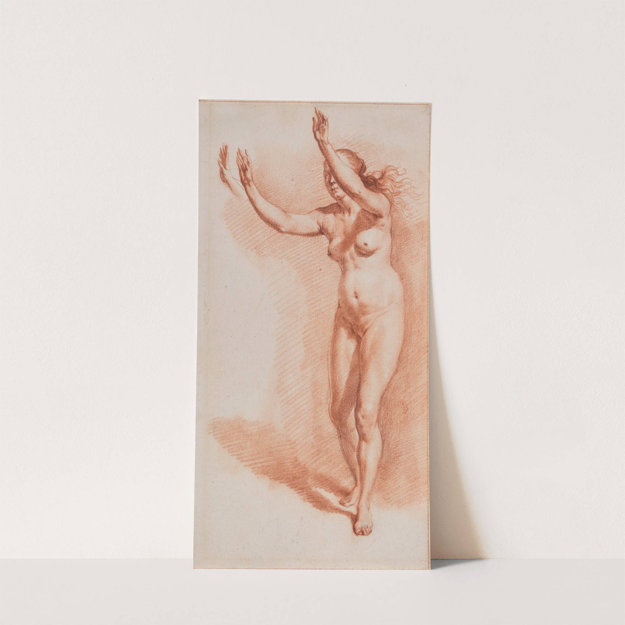 This exquisite art print showcases "Standing Nude Woman with Upraised Arms" by Adriaen van de Velde, rendered in delicate red chalk on paper. The figure is beautifully captured in a dynamic pose, her arms raised towards the top left corner,...